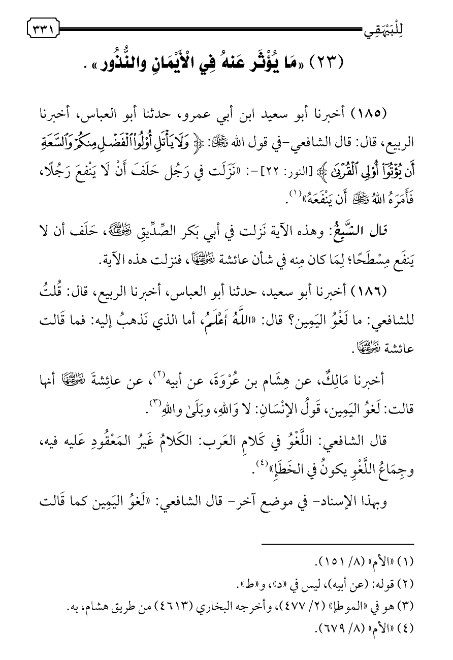 وبهذا الإسناد- في موضع آخر- قال الشافعي: «لَغوُ اليَمِين كما قَالت