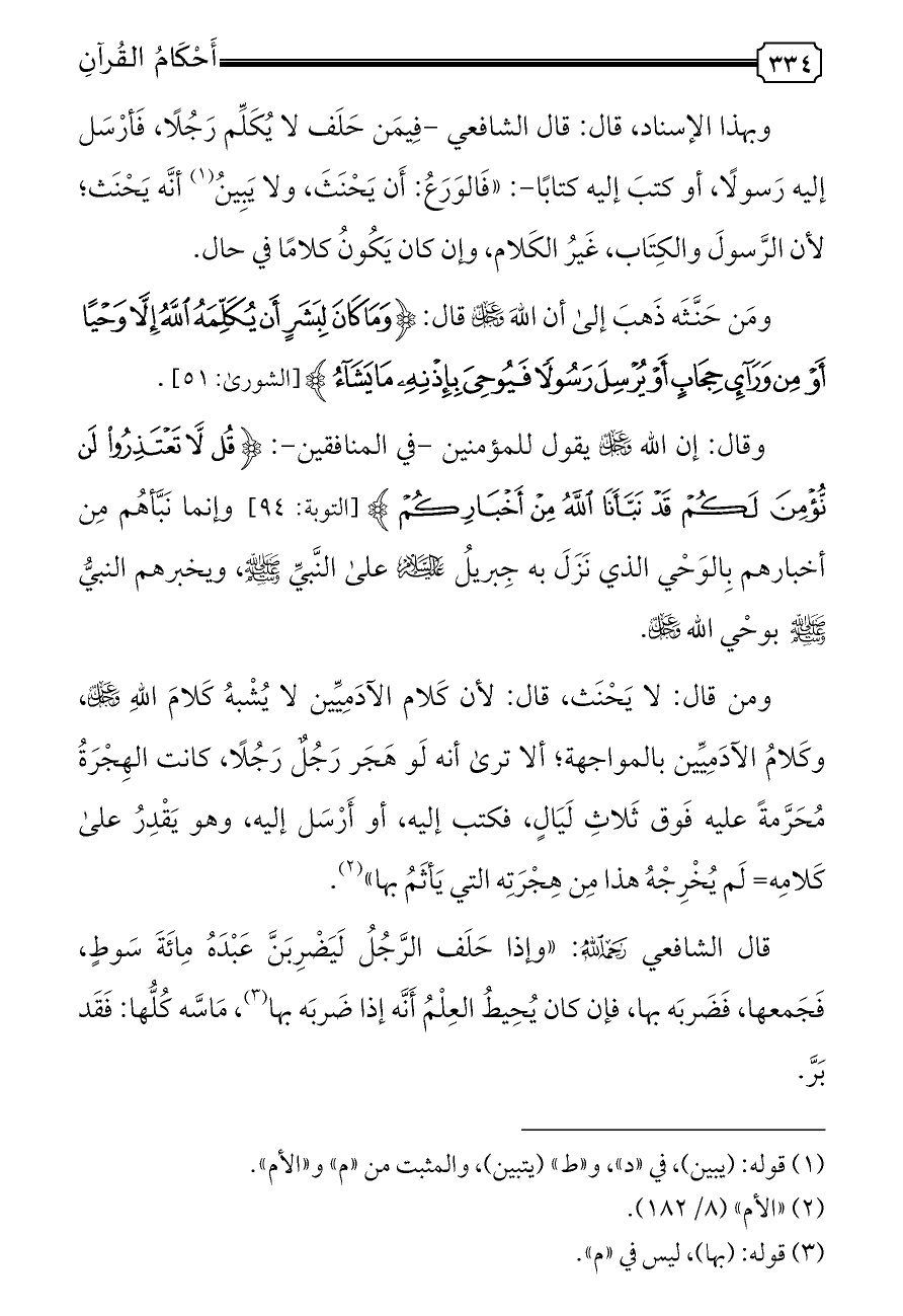 وبهذا الإسناد، قال: قال الشافعي -فِيمَن حَلَف لا يُكَلِّم رَجُلًا، فَأرْسَل إليه رَسولًا، أو كتبَ إليه كتابًا-: «فَالوَرَعُ: أَن يَحْنَثَ، ولا يَبِينُ (¬١) أنَّه يَحْنَث؛ لأن الرَّسولَ والكِتَاب، غَيرُ الكَلام، وإن كان يَكُونُ كلامًا في حال.