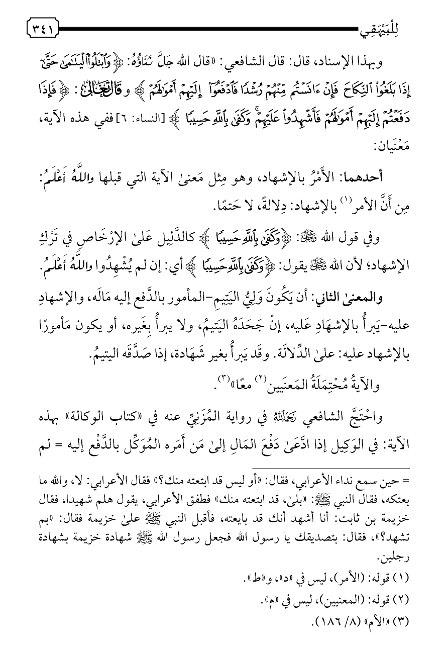 وبهذا الإسناد، قال: قال الشافعي: «قال الله جَلَّ ثَنَاؤُهُ: {وَابْتَلُوا الْيَتَامَى حَتَّى إِذَا بَلَغُوا النِّكَاحَ فَإِنْ آنَسْتُمْ مِنْهُمْ رُشْدًا فَادْفَعُوا إِلَيْهِمْ أَمْوَالَهُمْ} وقال تعالى: {فَإِذَا دَفَعْتُمْ إِلَيْهِمْ أَمْوَالَهُمْ فَأَشْهِدُوا عَلَيْهِمْ وَكَفَى بِاللَّهِ حَسِيبًا} [النساء: ٦] ففي هذه الآية، مَعْنَيان: