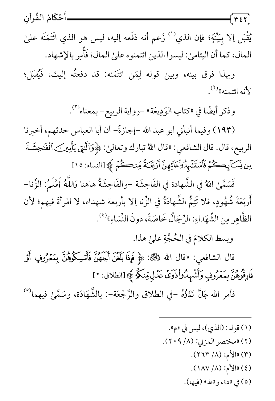 قال الشافعي: «قال الله - عز وجل -: {فَإِذَا بَلَغْنَ أَجَلَهُنَّ فَأَمْسِكُوهُنَّ بِمَعْرُوفٍ أَوْ فَارِقُوهُنَّ بِمَعْرُوفٍ وَأَشْهِدُوا ذَوَيْ عَدْلٍ مِنْكُمْ} [الطلاق: ٢]