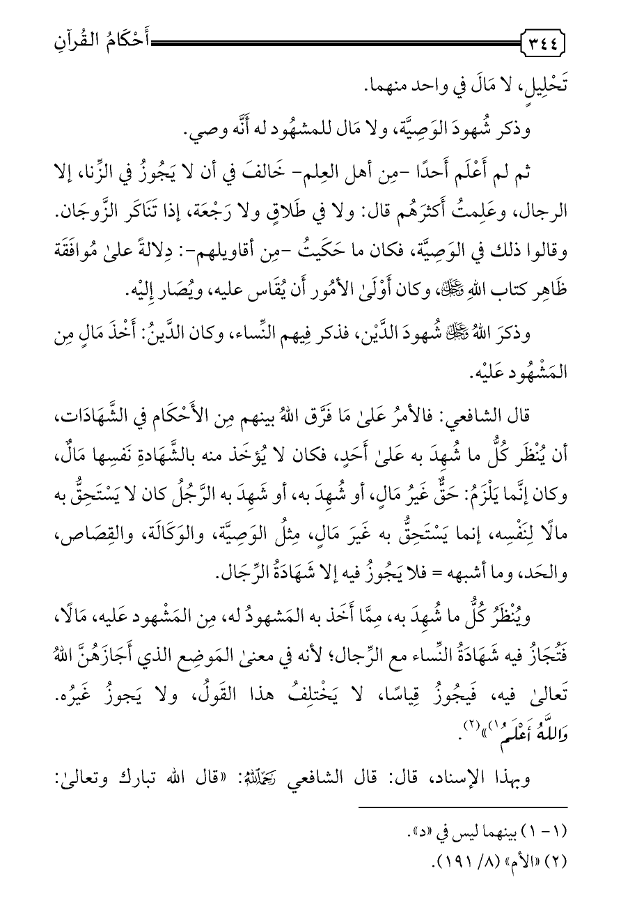 ثم لم أَعْلَم أَحدًا -مِن أهل العِلم- خَالفَ في أن لا يَجُوزُ في الزِّنا، إلا الرجال، وعَلِمتُ أَكثرَهُم قال: ولا في طَلاقٍ ولا رَجْعَة، إذا تَنَاكَر الزَّوجَان. وقالوا ذلك في الوَصِيَّة، فكان ما حَكَيتُ -مِن أقاويلهم-: دِلالةً على مُوافَقَة ظَاهِر كتاب اللهِ - عز وجل -، وكان أَوْلَى الأمُور أَن يُقَاس عليه، ويُصَار إِليْه.