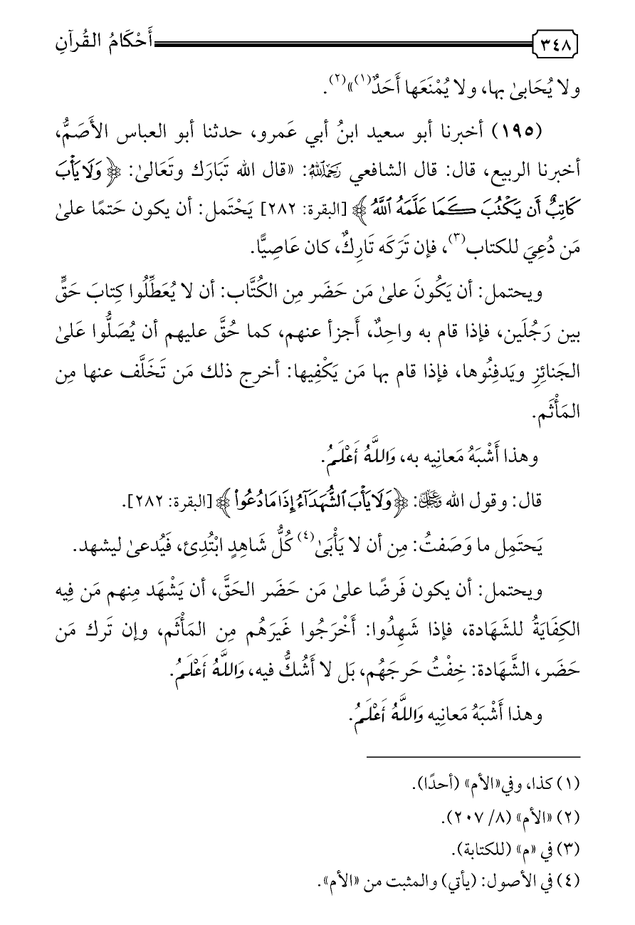 (١٩٥) أخبرنا أبو سعيد ابنُ أبي عَمرو، حدثنا أبو العباس الأَصَمُّ، أخبرنا الربيع، قال: قال الشافعي - رحمه الله -: «قال الله تَبَارَك وتَعَالى: {وَلَا يَأْبَ كَاتِبٌ أَنْ يَكْتُبَ كَمَا عَلَّمَهُ اللَّهُ} [البقرة: ٢٨٢] يَحْتَمل: أن يكون حَتمًا على مَن دُعِيَ للكتاب (¬٣)، فإن تَرَكَه تَارِكٌ، كان عَاصِيًّا.