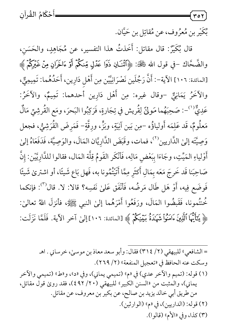 قال بُكَيْرٌ: قال مقاتل: أَخَذتُ هذا التفسير، عن مُجَاهِدٍ، والحَسَنِ، والضَّحَّاك -في قول الله - عز وجل -: {اثْنَانِ ذَوَا عَدْلٍ مِنْكُمْ أَوْ آخَرَانِ مِنْ غَيْرِكُمْ} [المائدة: ١٠٦] الآية-: أَنَّ رَجُلَين نَصْرَانِيَّيْن مِن أَهْلِ دَارِين، أَحَدُهُما: تَمِيمِيٌّ، والآخَرُ يَمَانِيٌّ -وقال غيره: مِن أَهْل دَارِين أحدهما: تَمِيمٌ، والآخَرُ: عَدِيٌّ (¬١) -: صَحِبَهُما مَولىً لِقُريش في تِجَارةٍ، فَرَكِبُوا البَحرَ، ومَع القُرشِيِّ مَالٌ مَعلُومٌ، قَد عَلِمَه أَولياؤُه -مِن بَين آنِيَةٍ، وبَزٍّ، ورِقَّةٍ- فَمَرِضَ القُرَشِيُّ، فجعل وَصِيَّتَه إلى الدَّاريين (¬٢)،