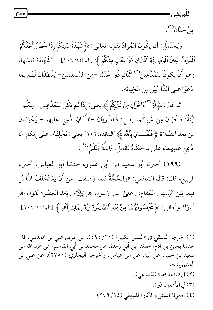 ويَحْتَمِلُ: أن يكُونَ المُرادُ بقوله تعالى: {شَهَادَةُ بَيْنِكُمْ إِذَا حَضَرَ أَحَدَكُمُ الْمَوْتُ حِينَ الْوَصِيَّةِ اثْنَانِ ذَوَا عَدْلٍ مِنْكُمْ} [المائدة: ١٠٦]: الشَّهَادَةَ نفسَها، وهو أَنْ يكونَ للمُدَّعِينَ (¬٢) اثْنَانِ ذَوا عَدْلٍ -مِن المُسلمين- يَشْهَدَان لَهُم بما ادَّعَوْا على الدَّارِيَّيْن مِن الخِيانَة.