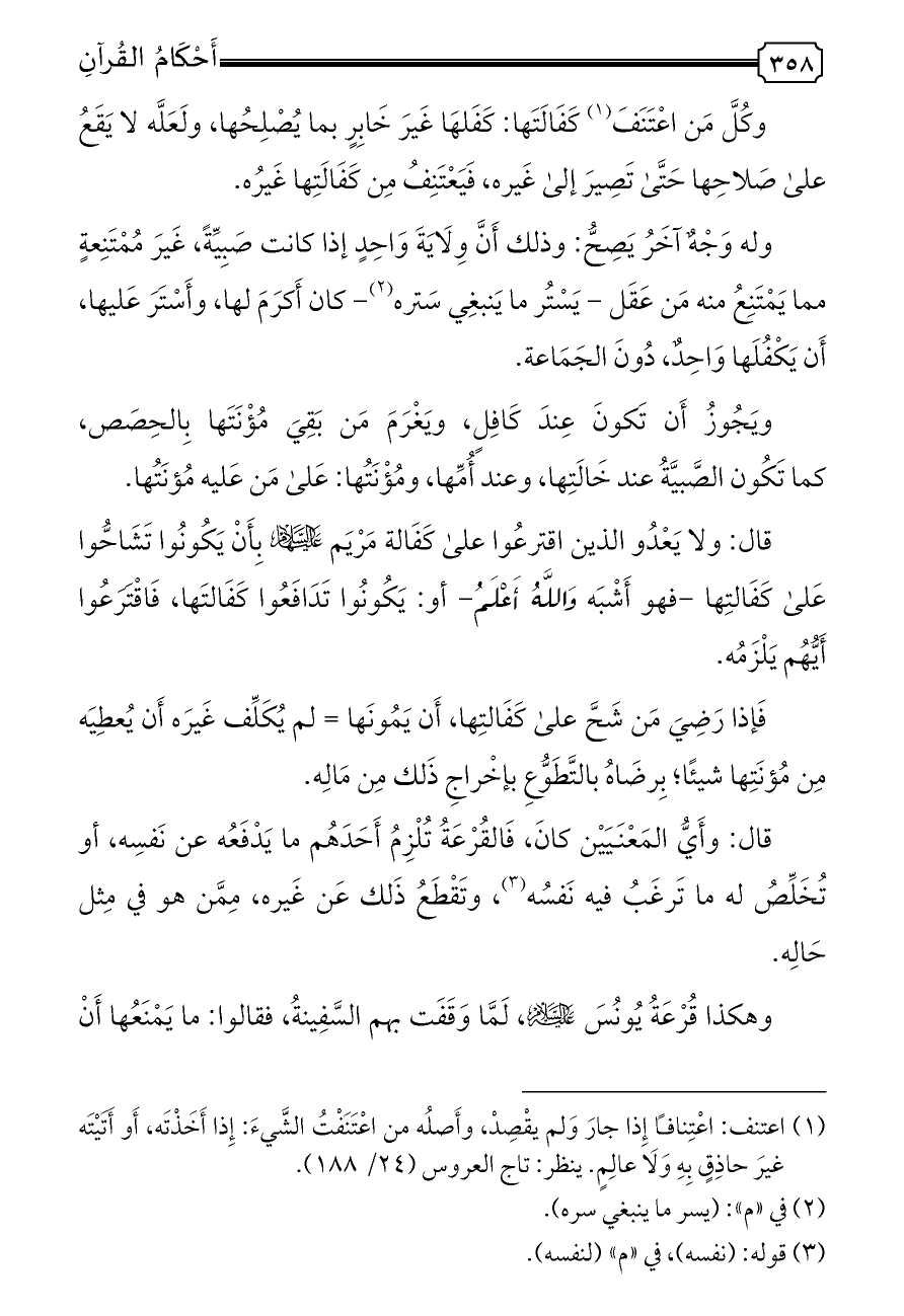 قال: ولا يَعْدُو الذين اقترعُوا على كَفَالة مَرْيَم - عليها السلام - بِأَنْ يَكُونُوا تَشَاحُّوا عَلى كَفَالتِها -فهو أَشْبَه وَاللَّهُ أَعْلَمُ- أو: يَكُونُوا تَدَافَعُوا كَفَالتَها، فَاقْتَرَعُوا أَيُّهُم يَلْزَمُه.