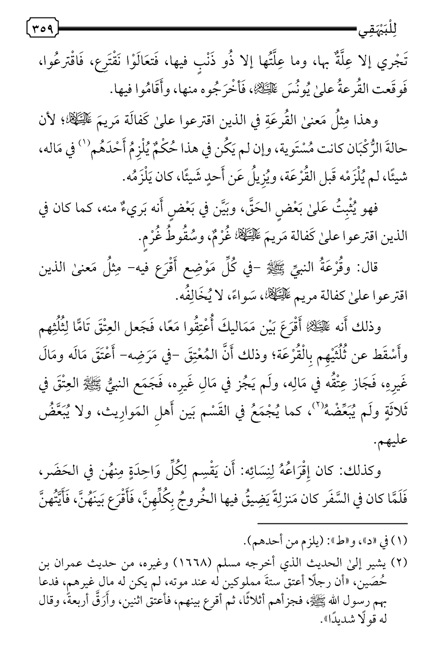 (¬٢) يشير إلى الحديث الذي أخرجه مسلم (١٦٦٨) وغيره، من حديث عمران بن حُصَين، «أن رجلًا أعتق ستةَ مملوكين له عند موته، لم يكن له مال غيرهم، فدعا بهم رسول الله - صلى الله عليه وسلم -، فجزأهم أثلاثًا، ثم أقرع بينهم، فأعتق اثنين، وأَرَقَّ أربعةً، وقال له قولًا شديدًا».