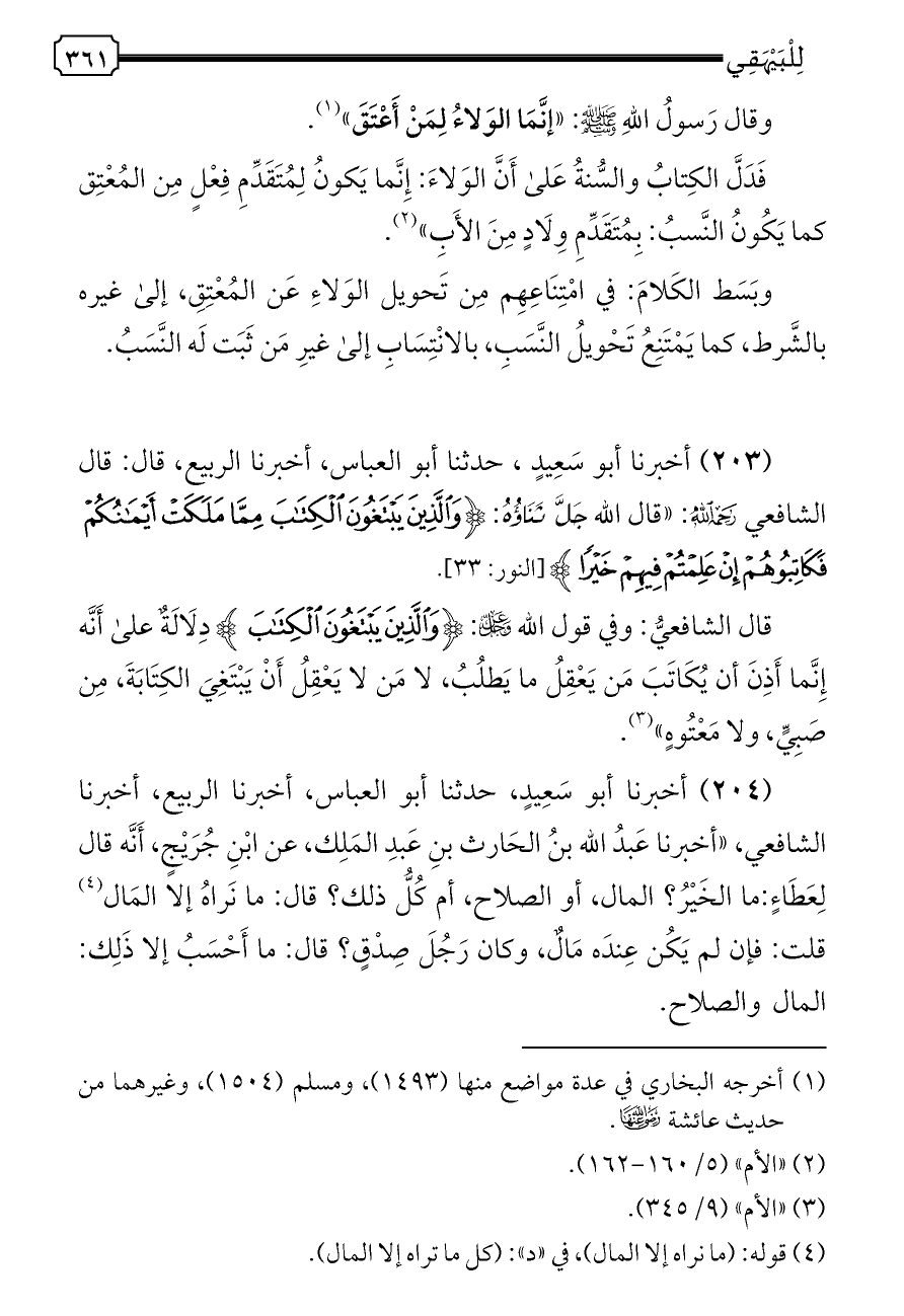(٢٠٣) أخبرنا أبو سَعِيدٍ، حدثنا أبو العباس، أخبرنا الربيع، قال: قال الشافعي - رحمه الله -: «قال الله جَلَّ ثَنَاؤُهُ: {وَالَّذِينَ يَبْتَغُونَ الْكِتَابَ مِمَّا مَلَكَتْ أَيْمَانُكُمْ فَكَاتِبُوهُمْ إِنْ عَلِمْتُمْ فِيهِمْ خَيْرًا} [النور: ٣٣].