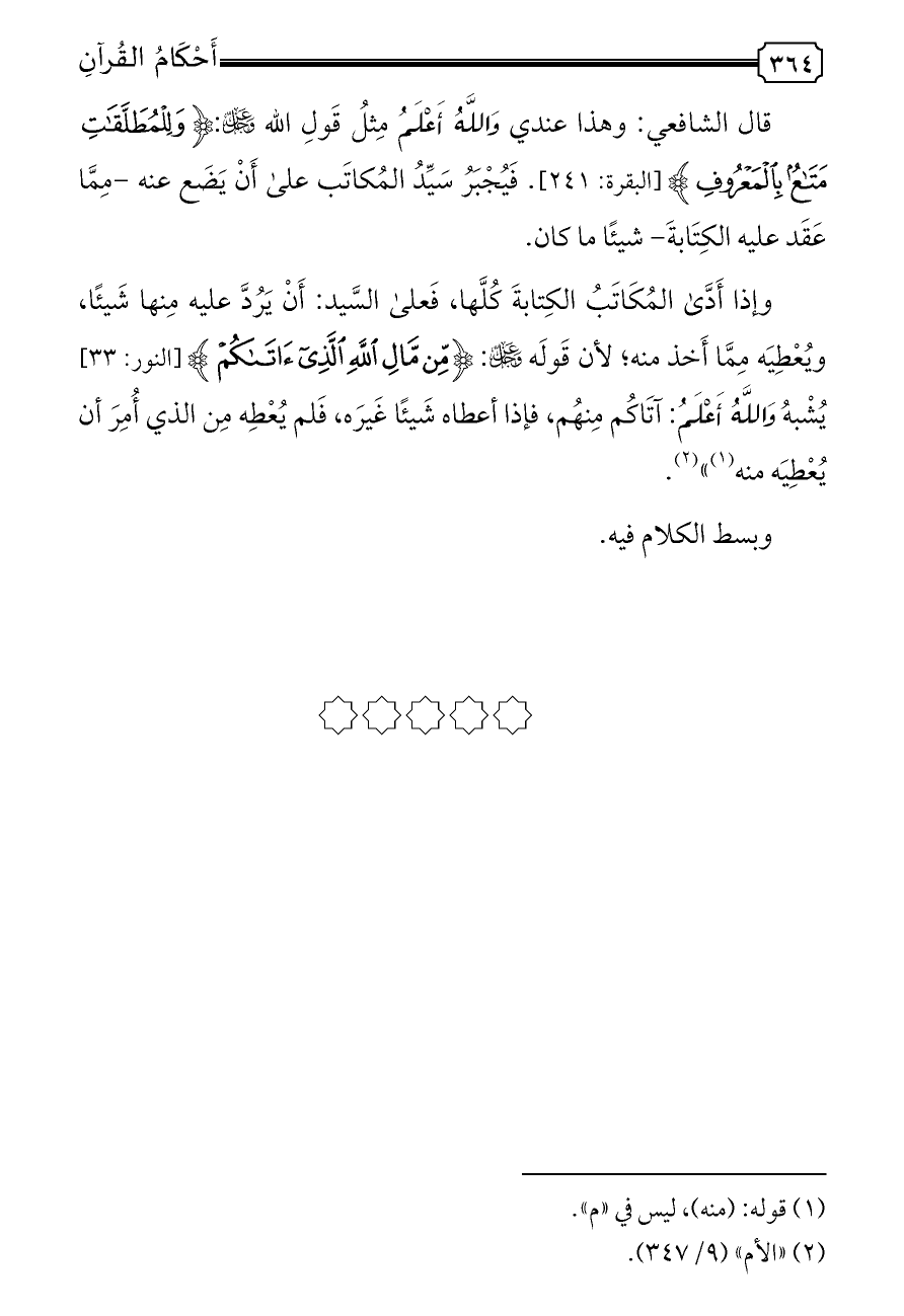 قال الشافعي: وهذا عندي وَاللَّهُ أَعْلَمُ مِثلُ قَولِ الله - عز وجل -: {وَلِلْمُطَلَّقَاتِ مَتَاعٌ بِالْمَعْرُوفِ} [البقرة: ٢٤١]. فَيُجْبَرُ سَيِّدُ المُكاتَب على أَنْ يَضَع عنه -مِمَّا عَقَد عليه الكِتَابةَ- شيئًا ما كان.