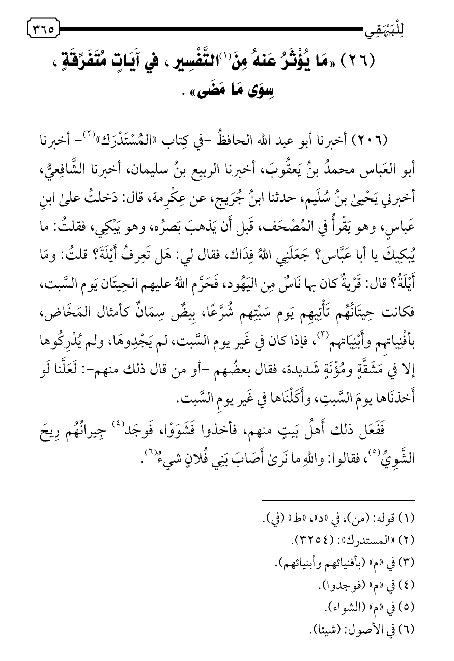 (٢٠٦) أخبرنا أبو عبد الله الحافظُ -في كِتاب «المُسْتَدْرَك» (¬٢) - أخبرنا أبو العَباس محمدُ بنُ يَعقُوبَ، أخبرنا الربيع بنُ سليمان، أخبرنا الشَّافِعيُّ، أخبرني يَحْيى بنُ سُلَيم، حدثنا ابنُ جُرَيج، عن عِكْرِمة، قال: دَخلتُ على ابنِ عَباسٍ، وهو يَقْرأُ في المُصْحَف، قَبل أَن يَذهبَ بَصرُه، وهو يَبْكِي، فقلتُ: ما يُبكِيكَ يا أبا عَبَّاس؟ جَعَلَنِي اللهُ فِدَاك، فقال لي: هَل تَعِرفُ أَيْلَةَ؟ قلتُ: ومَا أَيْلَةُ؟ قال: قَرْيةٌ كان بها نَاسٌ مِن اليَهُود، فَحَرَّم اللهُ عليهم الحِيتَان يَوم السَّبت، فكانت حِيتَانُهُم تَأْتِيهِم يَوم سَبْتِهم شُرَّعًا، بِيضٌ سِمَانٌ كأمثال المَخَاض، بأفْنِياتهِم وأَبْنِيَاتهم (¬٣)، فإذا كان في غَير يوم السَّبت، لم يَجْدِوهَا، ولم يُدْرِكُوها إلا في مَشَقَّةٍ ومُؤْنَةٍ شَديدة، فقال بعضُهم -أو من قال ذلك منهم-: لَعَلَّنا لَو أَخذنَاها يومَ السَّبتِ، وأَكَلْنَاها في غَير يومِ السَّبت.