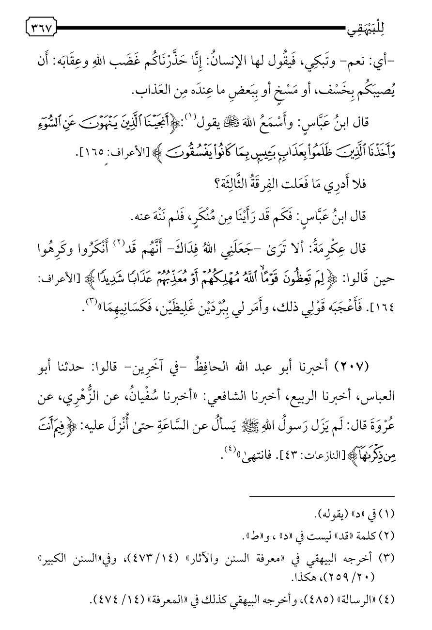 (٢٠٧) أخبرنا أبو عبد الله الحافِظُ -في آخَرِين- قالوا: حدثنا أبو العباس، أخبرنا الربيع، أخبرنا الشافعي: «أخبرنا سُفْيانُ، عن الزُّهْرِي، عن عُرْوَةَ قال: لَم يَزَل رَسولُ اللهِ - صلى الله عليه وسلم - يَسألُ عن السَّاعَةِ حتى أُنْزلَ عليه: {فِيمَ أَنْتَ مِنْ ذِكْرَاهَا} [النازعات: ٤٣]. فانتهى» (¬٤).