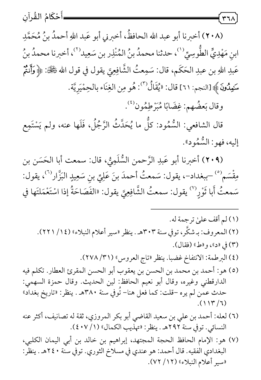 (٢٠٨) أخبرنا أبو عبد الله الحافظُ، أخبرني أبو عَبد اللهِ أحمدُ بنُ مُحَمَّدِ ابنِ مَهْدِيٍّ الطُّوسِيِّ (¬١)، حدثنا محمدُ بنُ المُنْذِر بن سَعِيد (¬٢)، أخبرنا محمدُ بنُ ... عَبدِ اللهِ بن عبدِ الحَكَم، قال: سَمِعتُ الشَّافِعِيَّ يقول في قول الله - عز وجل -: {وَأَنْتُمْ سَامِدُونَ} [النجم: ٦١] قال: «يُقَالُ (¬٣): هُو مِن الغِنَاء بالحِمْيَرِيَّة.