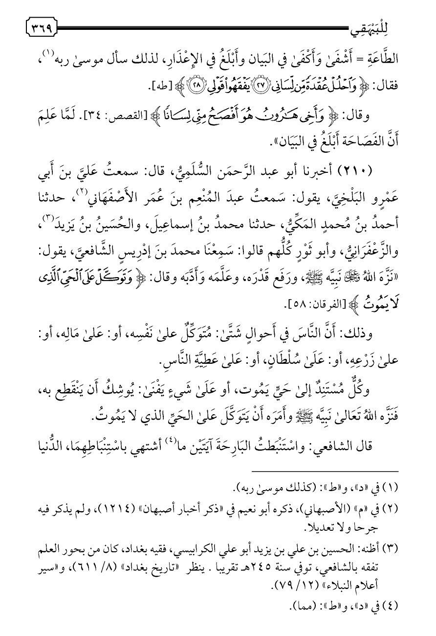 (٢١٠) أخبرنا أبو عبد الرَّحمَن السُّلَمِيُّ، قال: سمعتُ عَليَّ بنَ أَبي عَمْرٍو البَلْخِيَّ، يقول: سَمعتُ عبدَ المُنْعِم بنَ عُمَر الأَصْفَهَاني (¬٢)، حدثنا أحمدُ بنُ مُحمدٍ المَكِّيُّ، حدثنا محمدُ بنُ إسماعِيلَ، والحُسَينُ بنُ يَزيدَ (¬٣)، والزَّعْفَرَانِيُّ، وأبو ثَوْرٍ كُلُّهم قالوا: سَمِعْنَا محمدَ بنَ إدْرِيسٍ الشَّافعيَّ، يقول: «نَزَّهَ اللهُ - عز وجل - نَبِيَّه - صلى الله عليه وسلم -، ورَفَع قَدْرَه، وعَلَّمَه وَأَدَّبَه وقال: {وَتَوَكَّلْ عَلَى الْحَيِّ الَّذِي لَا يَمُوتُ} [الفرقان: ٥٨].