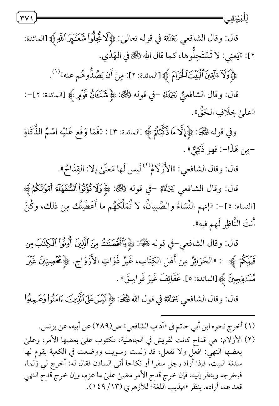 قال: وقال الشافعي - رحمه الله - في قوله تعالى: {لَا تُحِلُّوا شَعَائِرَ اللَّهِ} [المائدة: ٢]: «يَعنِي: لا تَسْتَحِلُّوها، كما قال الله - عز وجل - في الهَدْي.