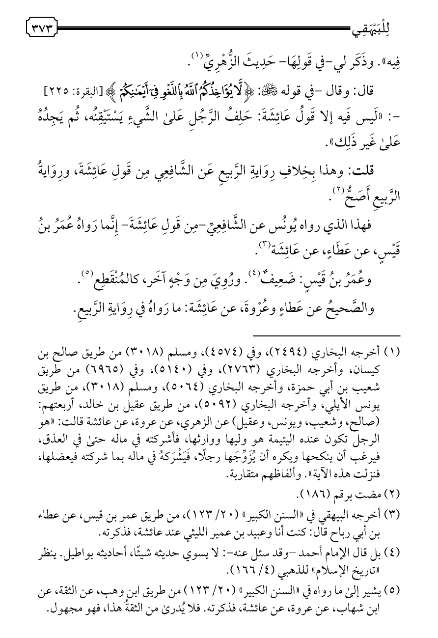 قال: وقال -في قوله - عز وجل -: {لَا يُؤَاخِذُكُمُ اللَّهُ بِاللَّغْوِ فِي أَيْمَانِكُمْ} [البقرة: ٢٢٥]-: «لَيس فَيه إلا قَولُ عَائِشَةَ: حَلِفُ الرَّجُلِ عَلى الشَّيءِ يَسْتَيْقِنُه، ثُم يَجِدُهُ عَلى غَير ذَلِك».