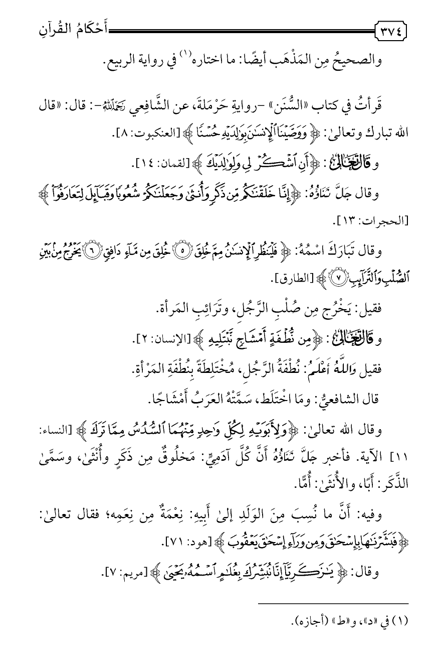 قَرأتُ في كتاب «السُّنَن» -روايةِ حَرْمَلةَ، عن الشَّافِعي - رحمه الله -: قال: «قال الله تبارك وتعالى: {وَوَصَّيْنَا الْإِنْسَانَ بِوَالِدَيْهِ حُسْنًا} [العنكبوت: ٨].