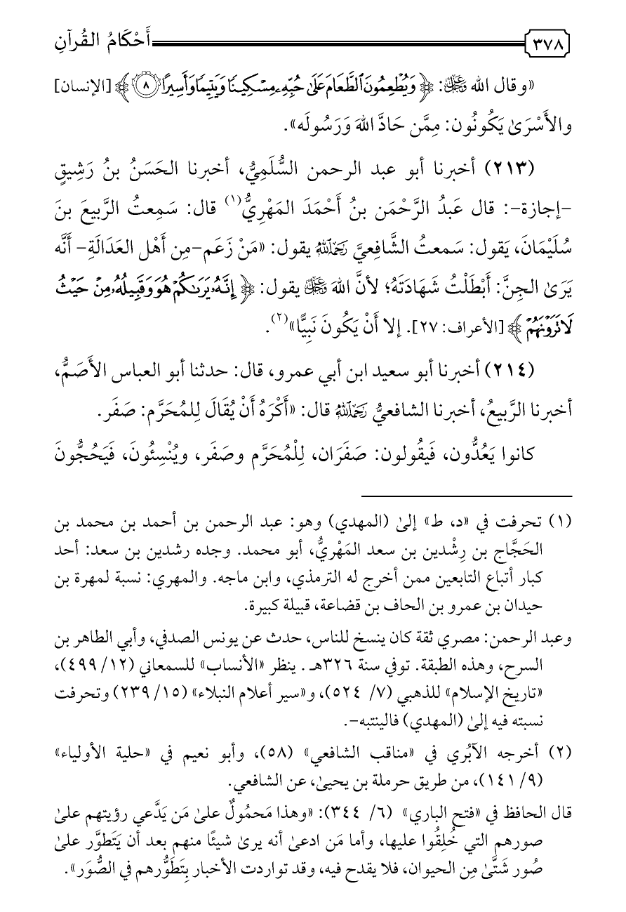 (٢١٤) أخبرنا أبو سعيد ابن أبي عمرو، قال: حدثنا أبو العباس الأَصَمُّ، أخبرنا الرَّبيعُ، أخبرنا الشافعيُّ - رحمه الله - قال: «أَكْرَهُ أَنْ يُقَالَ لِلمُحَرَّم: صَفَر.