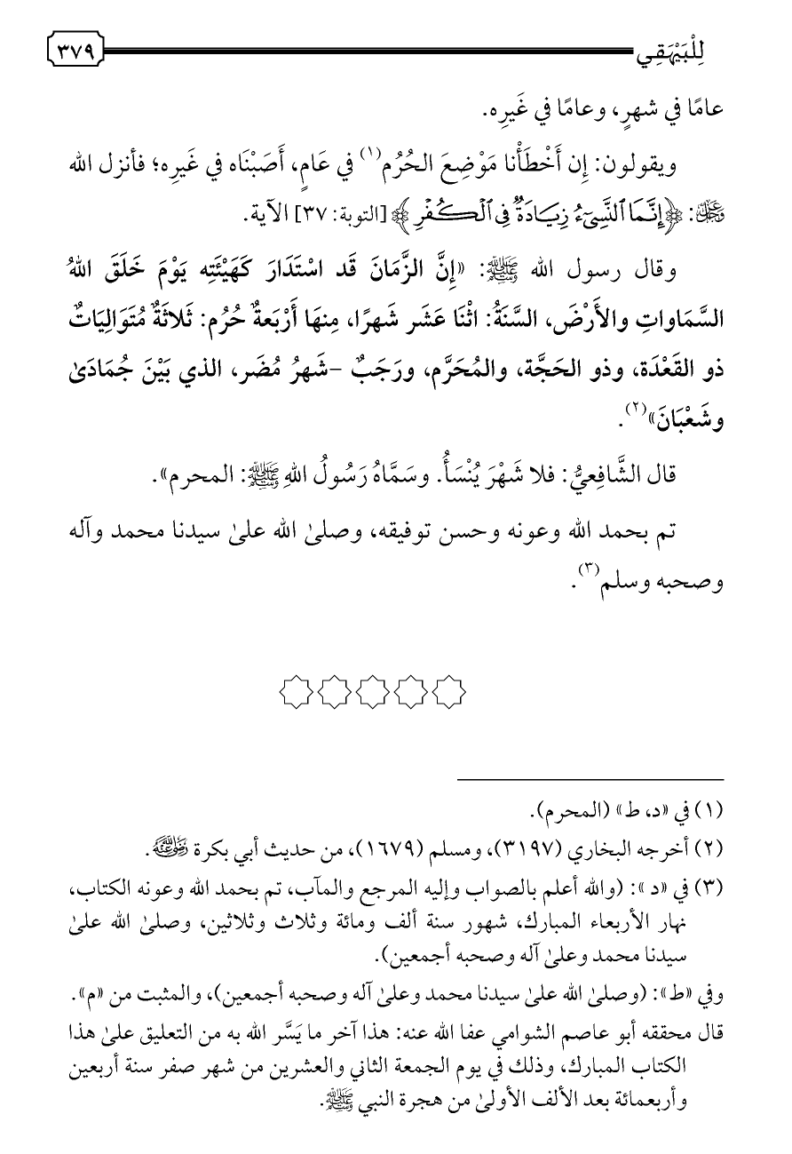 قال الشَّافِعيُّ: فلا شَهْرَ يُنْسَأُ. وسَمَّاهُ رَسُولُ اللهِ - صلى الله عليه وسلم -: المحرم».