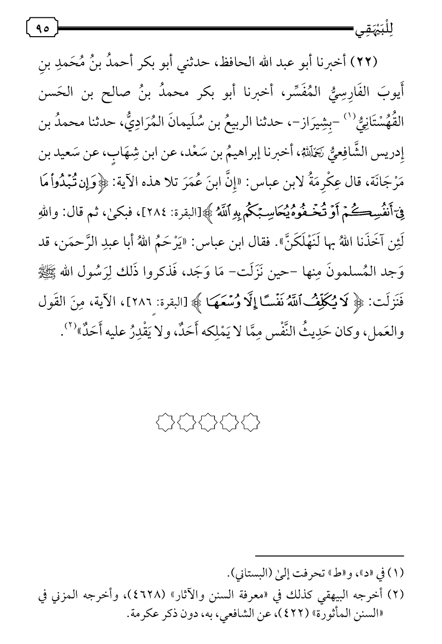 (٢٢) أخبرنا أبو عبد الله الحافظ، حدثني أبو بكر أحمدُ بنُ مُحَمدِ بنِ أَيوبَ الفَارِسِيُّ المُفَسِّر، أخبرنا أبو بكر محمدُ بنُ صالح بن الحَسن القُهُسْتَانِيُّ (¬١) -بِشِيرَاز-، حدثنا الربيعُ بن سُلَيمانَ المُرَادِيُّ، حدثنا محمدُ بن إِدريس الشَّافِعيُّ - رحمه الله -، أخبرنا إبراهيمُ بن سَعْد، عن ابن شِهَابٍ، عن سَعيد بن مَرْجَانَة، قال عِكْرِمَةُ لابن عباس: «إِنَّ ابنَ عُمَرَ تلا هذه الآية: {وَإِنْ تُبْدُوا مَا فِي أَنْفُسِكُمْ أَوْ تُخْفُوهُ يُحَاسِبْكُمْ بِهِ اللَّهُ} [البقرة: ٢٨٤]، فبكى، ثم قال: واللهِ لَئِن آخَذَنا اللهُ بها لَنَهْلَكَنَّ». فقال ابن عباس: «يَرْحَمُ اللهُ أبا عبدِ الرَّحمَن، قد وَجد المُسلمونَ مِنها -حين نَزَلَت- مَا وَجَد، فَذكروا ذَلك لِرَسُول الله - صلى الله عليه وسلم - فَنَزلَت: {لَا يُكَلِّفُ اللَّهُ نَفْسًا إِلَّا وُسْعَهَا} [البقرة: ٢٨٦]، الآية، مِنَ القَول والعَمل، وكان حَدِيثُ النَّفْس مِمَّا لا يَمْلِكه أَحَدٌ، ولا يَقْدِرُ عليه أَحَدٌ» (¬٢).