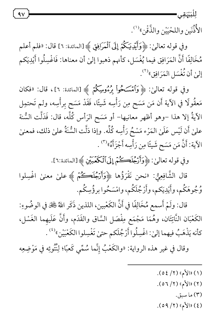قال: ولَمْ أَسمع مُخَالِفًا في أَنَّ الكَعْبين، اللذين ذَكَر اللهُ - عز وجل - في الوضُوءِ: الكَعْبَان النَّاتِئَان، وهُمَا مَجْمَع مِفْصَل السَّاق والقَدَم، وأَنَّ عَلَيهِما الغَسْل، كأنه يَذْهَبُ فيهما إلى: اغْسِلُوا أَرْجُلَكم حتى تَغْسِلوا الكَعْبَيْن» (¬٤).