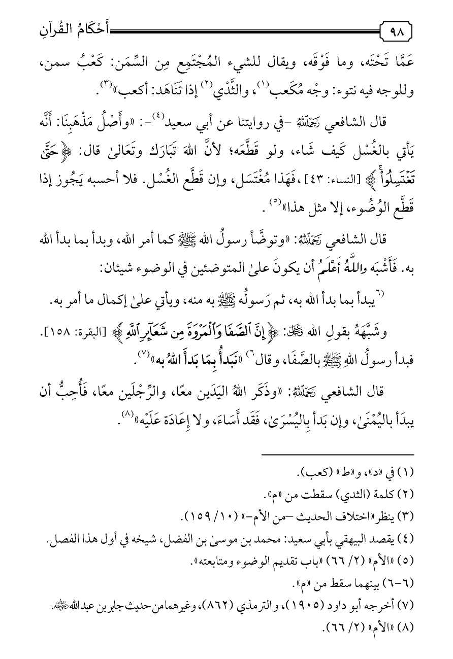 قال الشافعي - رحمه الله -: «وتوضَّأ رسولُ الله - صلى الله عليه وسلم - كما أمر الله، وبدأ بما بدأ الله به. فَأَشْبَه واللَّهُ أَعْلَمُ أن يكونَ على المتوضئين في الوضوء شيئان: (¬٦) يبدأ بما بدأ الله به، ثم رَسولُه - صلى الله عليه وسلم - به منه، ويأتي على إكمال ما أمر به.