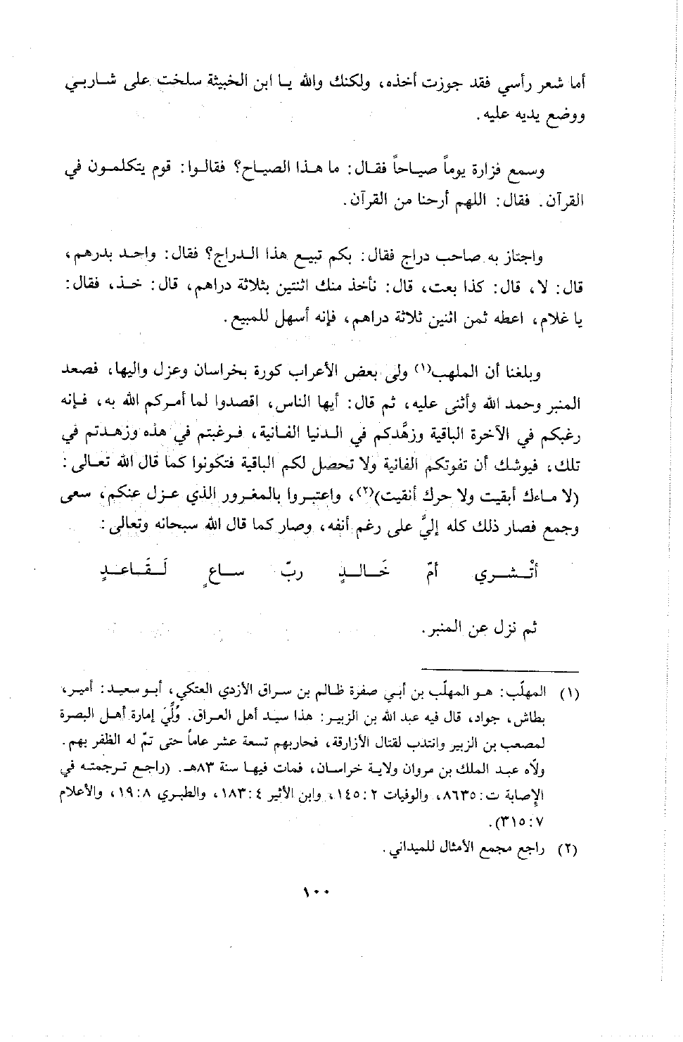 وبلغنا أن المهلب ولى بعض الأعراب كورة بخراسان وعزل واليها فصعد المنبر وحمد الله وأثنى عليه ثم قال: أيها الناس اقصدوا لما أمركم الله به، فإنه رغبكم في الآخرة الباقية وزهدكم في الدنيا الفانية، فرغبتم في هذه وزهدتم في تلك، فيوشك أن تفوتكم الفانية ولا تحصل لكم الباقية فتكونوا كما قال الله تعالى لا ماءك أبقيت ولا حرك أنقيت واعتبروا بالمغرور الذي عزل عنكم سعى وجمع فصار ذلك كله إلي على رغم أنفه وصار كما قال الله سبحانه وتعالى مجزوء الخفيف: