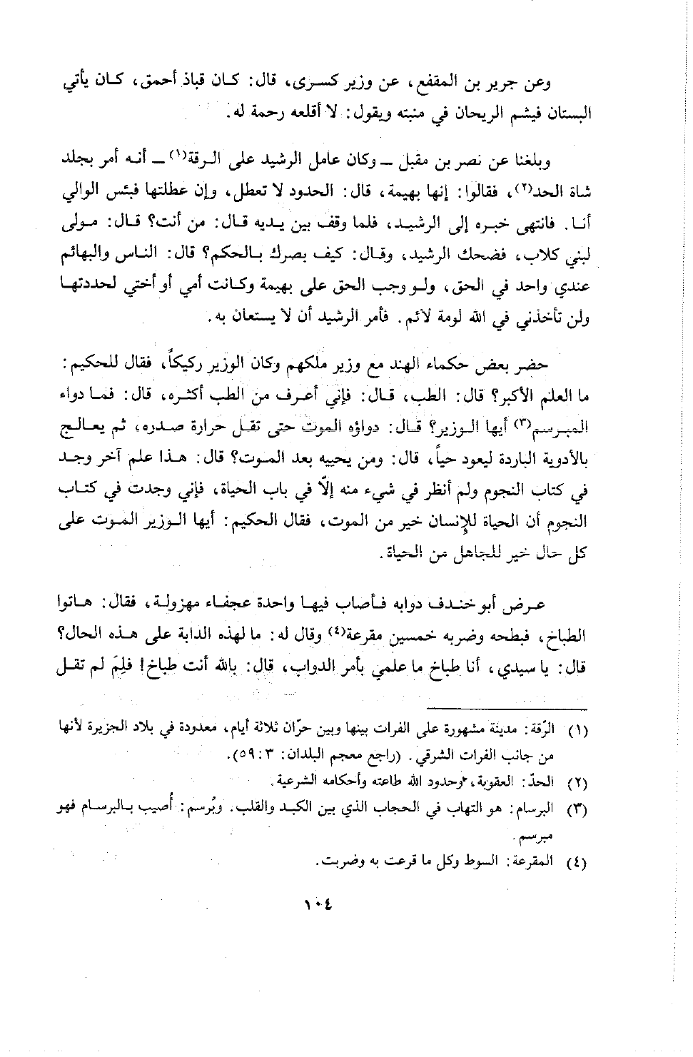 وعن جرير بن المقفع عن وزير كسرى قال: كان قباذ أحمق، كان يأتي البستان فيشم الريحان في منبته ويقول: لا أقلعه رحمة له. وبلغنا عن نصر بن مقبل وكان عامل الرشيد على الرقة، أنه أمر بجلد شاة الحد، فقالوا إنها بهيمة. قال: الحدود لا تعطل وإن عطلتها فبئس الوالي أنا. فانتهى خبره إلى الرشيد، فلما وقف بين يديه قال: من أنت؟ قال: مولى لبني كلاب، فضحك الرشيد وقال: كيف بصرك بالحكم؟ قال: الناس والبهائم عندي واحد في الحق، ولو وجب الحق على بهيمة وكانت أمي أو أختي لحددتها ولم تأخذني في الله لومة لائم. فأمر الرشيد أن لا يستعان به.