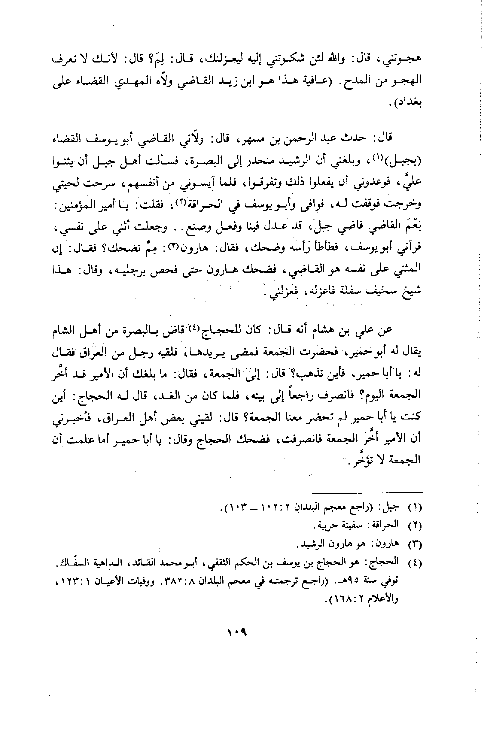 هجوتني. قال: والله لئن شكوتني إليه ليعزلنك، قال: لم؟ قال: لأنك لا تعرف الهجو من المدح. عافية هذا هو ابن زيد القاضي ولاه المهدي القضاء على بغداد.