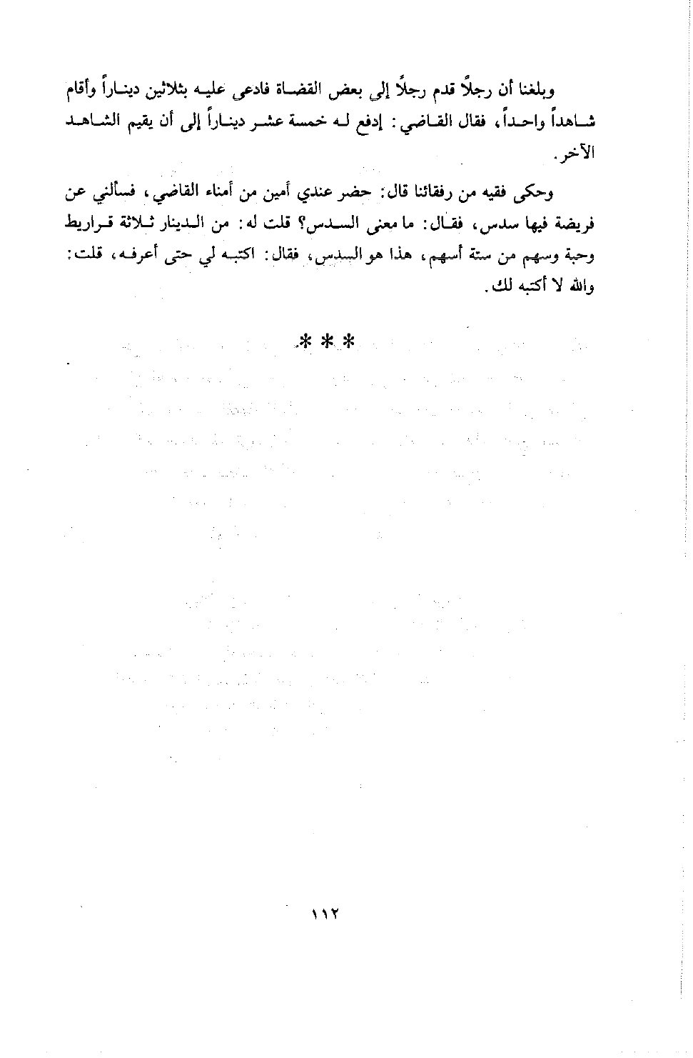 وحكى فقيه من رفقائنا قال: حضر عندي أمين من أمناء القاضي فسألني عن فريضة فيها سدس، فقال: ما معنى السدس؟ قلت له: من الدينار ثلاثة قراريط وحبة وسهم من ستة أسهم، هذا هو السدس، فقال: أكتبه لي حتى أعرفه، قلت: والله لا أكتبه لك.
