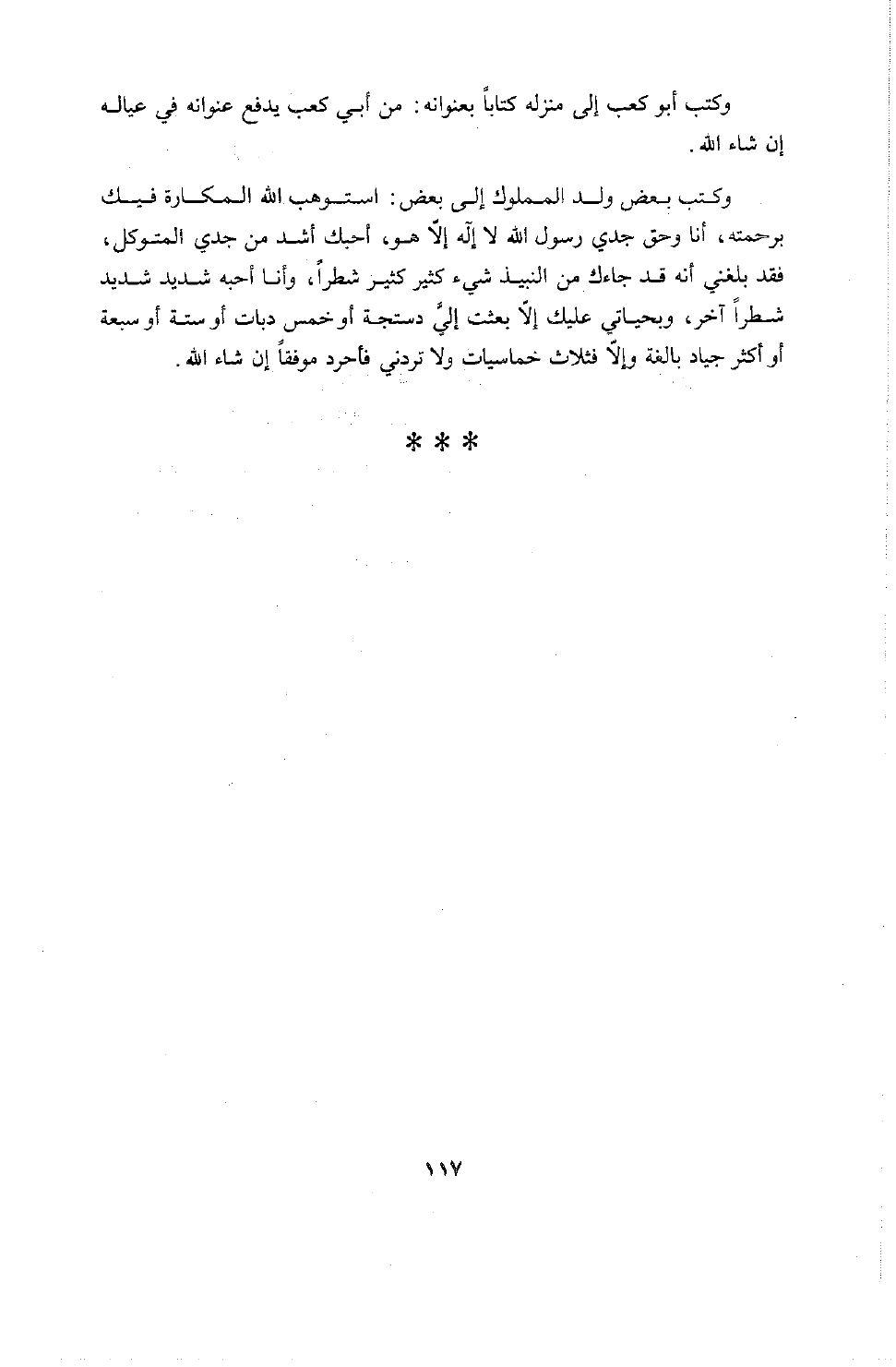 وكتب بعض ولد الملوك إلى بعض: استوهب الله المكاره فيك برحمته، أنا وحق جدي رسول الله الذي لا إله إلا هو، أحبك أشد من جدي المتوكل، فقد بلغني أنه قد جاءك من النبيذ شيء كثير كثير شطراً، وأنا أحبه شديد شديد شطراً آخر، وبحياتي عليك ألا بعثت إلي دستجة أو خمس دبات أو ستة أو سبعة أو أكثر جياد بالغة وإلا فثلاث خماسيات ولا تردني فأحرد موفقاً إن شاء الله.