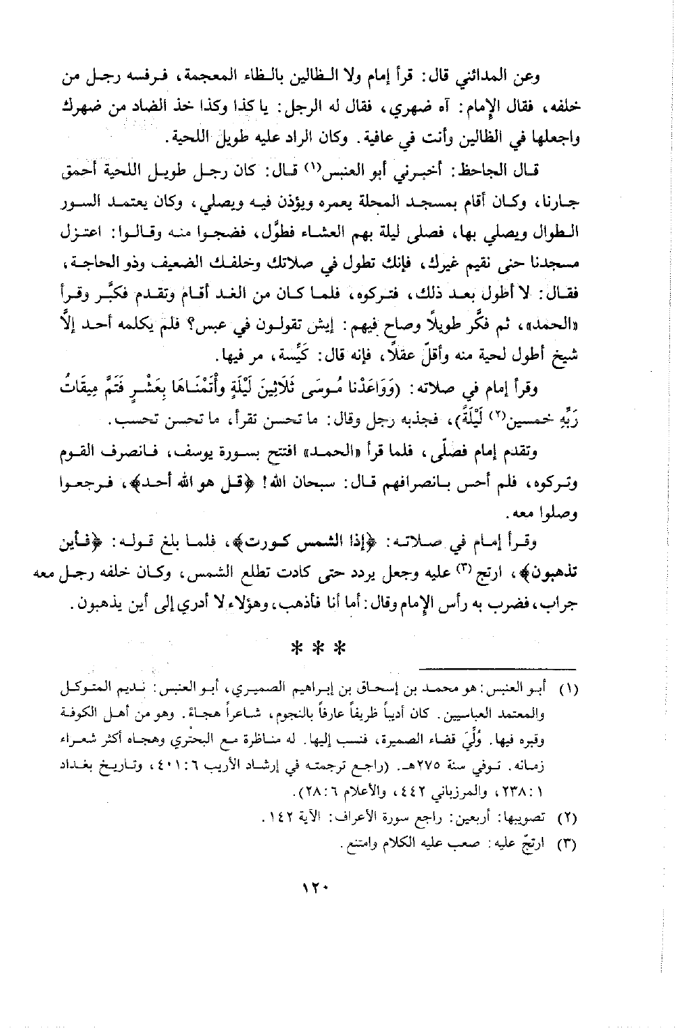 وقرأ إمام في صلاته: " إذا الشمس كورت " فلما بلغ قوله: " فأين تذهبون "، ارتج عيه وجعل يردد حتى كادت تطلع الشمس، وكان خلفه رجل معه جراب فضرب به رأس الإمام وقال: أما أنا فأذهب، وهؤلاء لا أدري إلى أين يذهبون.