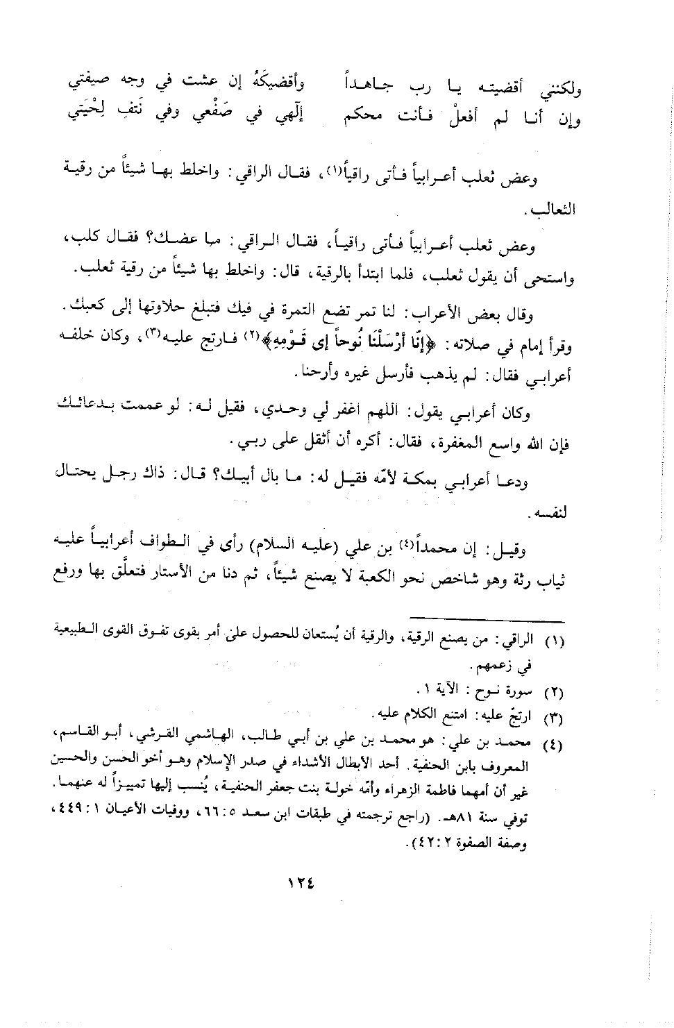 وقيل إن محمد بن علي عليه السلام رأى في الطواف أعرابياً عليه ثياب رثة وهو شاخص نحو الكعبة لا يصنع شيئاً، ثم دنا من الأستار فتعلق بها ورفع