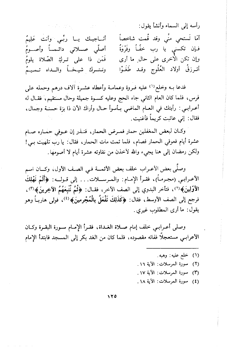 وصلى بعض الأعراب خلف بعض الأئمة في الصف الأول وكان اسم الأعرابي مجرماً فقرأ الإمام: والمرسلات.. إلى قوله: " ألم نهلك الأولين " فتأخر البدوي إلى الصف الآخر فقال: " ثم نتبعهم الآخرين " فرجع إلى الصف الأوسط فقال: " كذلك نفعل بالمجرمين " فولى هارباً وهو يقول: ما أرى المطلوب غيري.