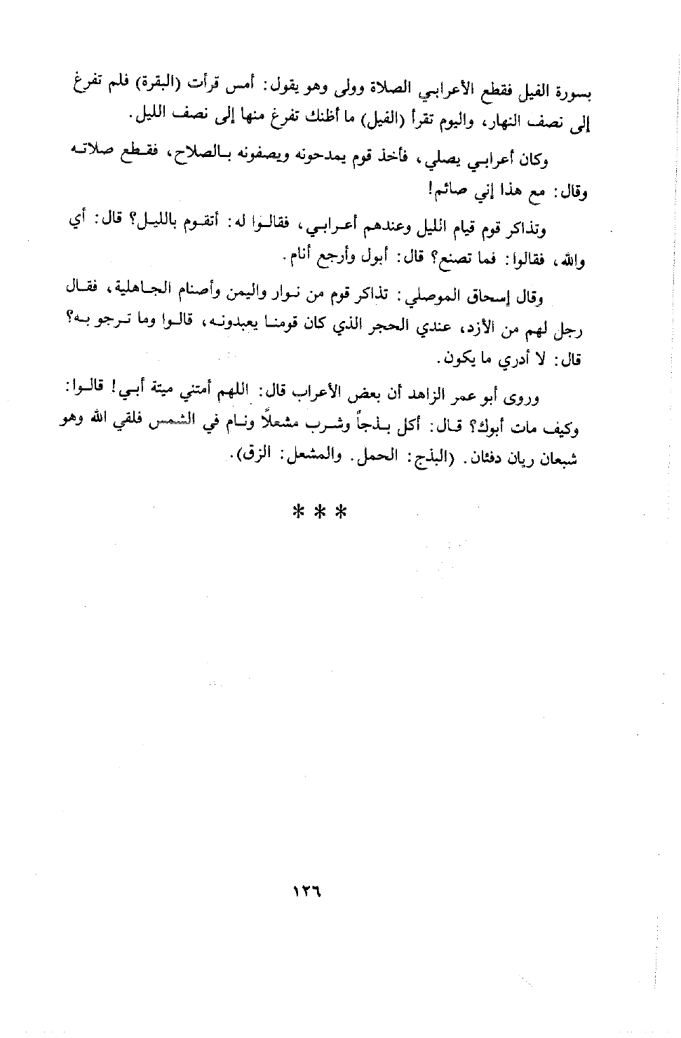 بسورة الفيل فقطع الأعرابي الصلاة وولى وهو يقول: أمس قرأت البقرة فلم تفرغ إلى نصف النهار، واليوم تقرأ الفيل ما أظنك تفرغ منها إلى نصف الليل.