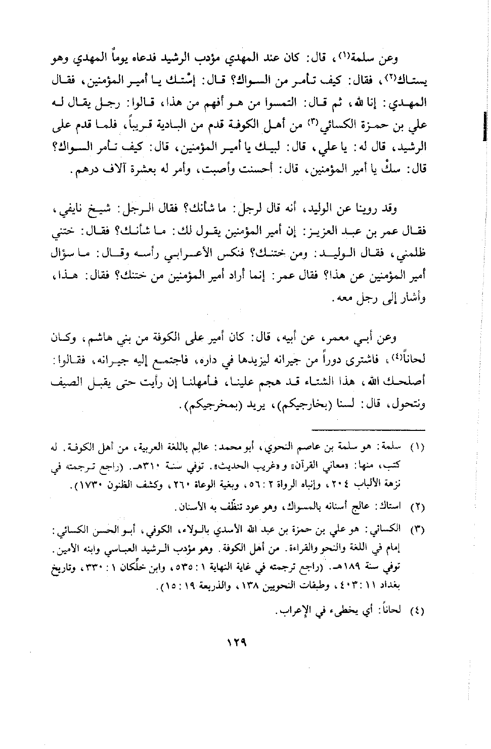 وعن سلمة قال: كان عند المهدي مؤدب يؤدب الرشيد فدعاه يوماً المهدي وهو يستاك فقال: كيف تأمر من السواك؟ قال: استك يا أمير المؤمنين، فقال المهدي: إنا لله، ثم قال: التمسوا من هو أفهم من هذا، قالوا: رجل يقال له علي بن حمزة الكسائي من أهل الكوفة قدم من البادية قريباً فلما قدم على الرشيد قال له: يا علي، قال: لبيك يا أمير المؤمنين، قال: كيف تأمر من السواك؟ قال: سك يا أمير المؤمنين، قال: أحسنت وأصبت. وأمر له بعشرة آلاف درهم.