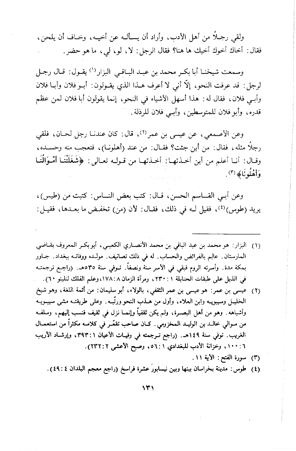 وسمعت شيخنا أبا بكر محمد بن عبد الباقي البزار يقول: قال رجل لرجل: قد عرفت النحو، إلا إني لا أعرف هذا الذي يقولون: أبو فلان وأبا فلان وأبي فلان. فقال له: هذا أسهل الأشياء في النحو، إنما يقولون: أبا فلان لمن عظم قدره، وأبو فلان للمتوسطين، وأبي فلان للرذلة.