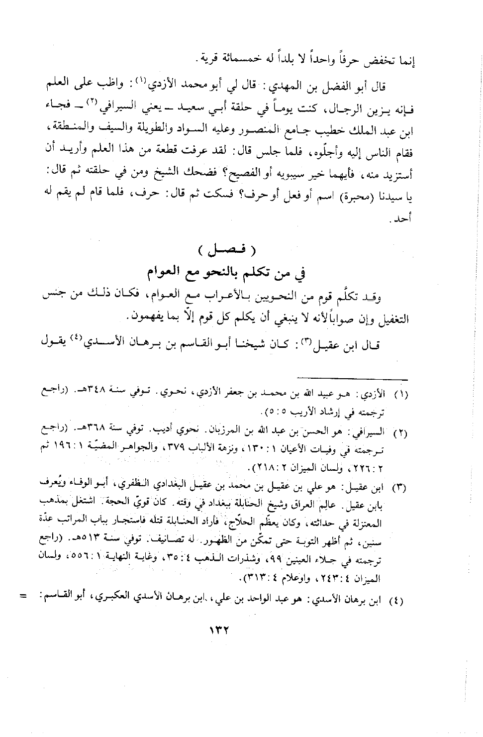 قال أبو الفضل بن المهدي: قال لي أبو محمد الأزدي: واظب على العلم فإنه يزين الرجال، كنت يوماً في حلقة أبي سعيد يعني السيرافي فجاء ابن عبد الملك خطيب جامع المنصور وعليه السواد والطويلة والسيف والمنطقة، فقام الناس إليه وأجلوه، فلما جلس قال: لقد عرفت قطعة من هذا العلم وأريد أن أستزيد منه، فأيهما خير سيبويه أو الفصيح؟ فضحك الشيخ ومن في حلقته ثم قال: يا سيدنا محبرة اسم أوفعل أو حرف؟ فسكت ثم قال: حرف. فلما قام لم يقم له أحد.