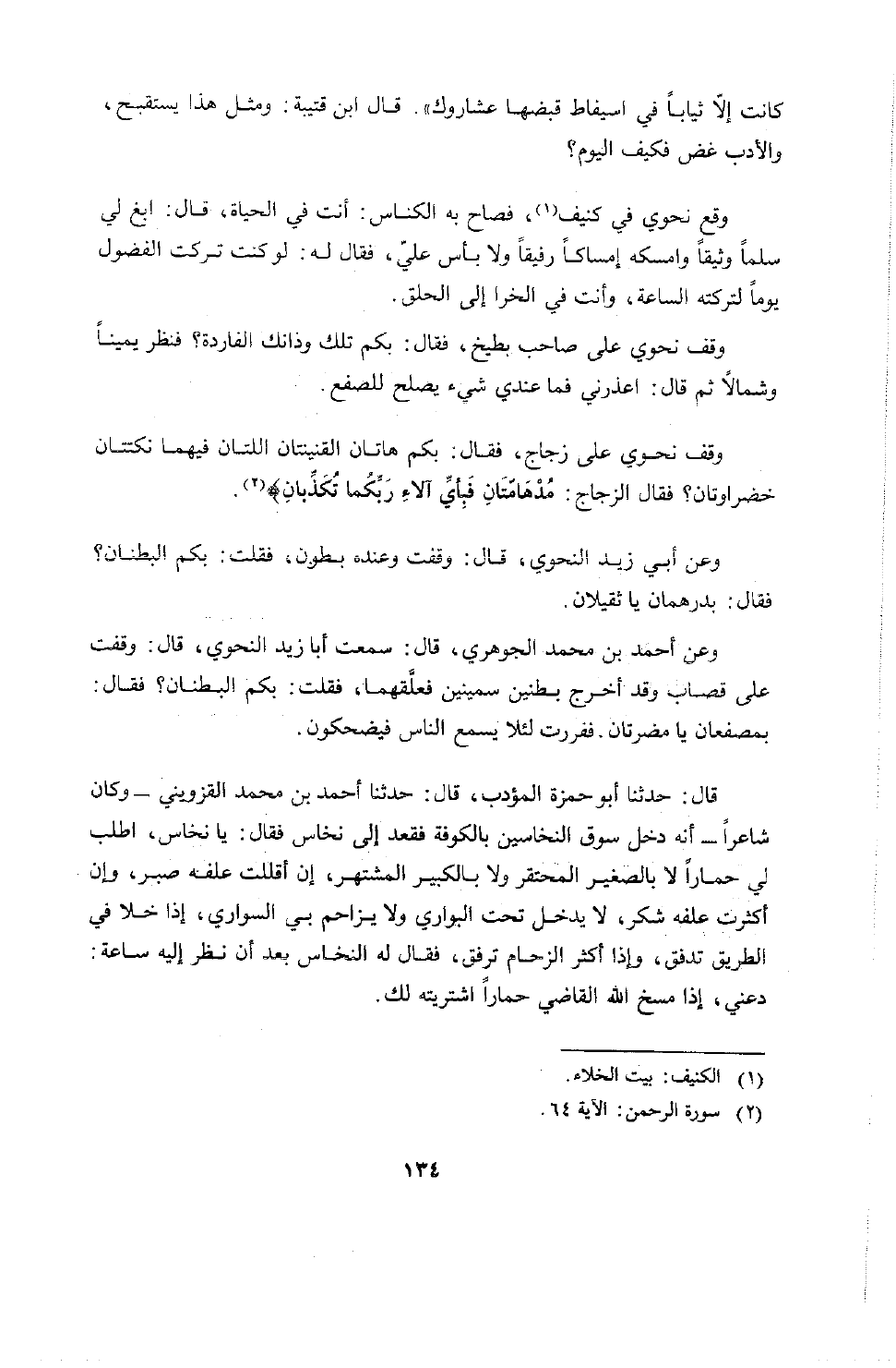 وعن أبي زيد النحوي قال: وقفت على قصاب وعنده بطون، فقلت: بكم البطنان؟ فقال: بدرهمان يا ثقيلان.