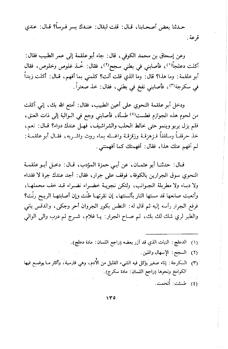 وعن إسحاق بن محمد الكوفي قال: جاء أبو علقمة إلى عمر الطبيب فقال: أكلت دعلجاً فأصابني في بطني سجح، فقال: خذ غلوص وخلوص، فقال أبو علقمة: وما هذا؟ قال: وما الذي قلت أنت؟ كلمني بما أفهم، قال: أكلت زبداً في سكرجة فأصابني نفخ في بطني، فقال: خذ صعتراً.