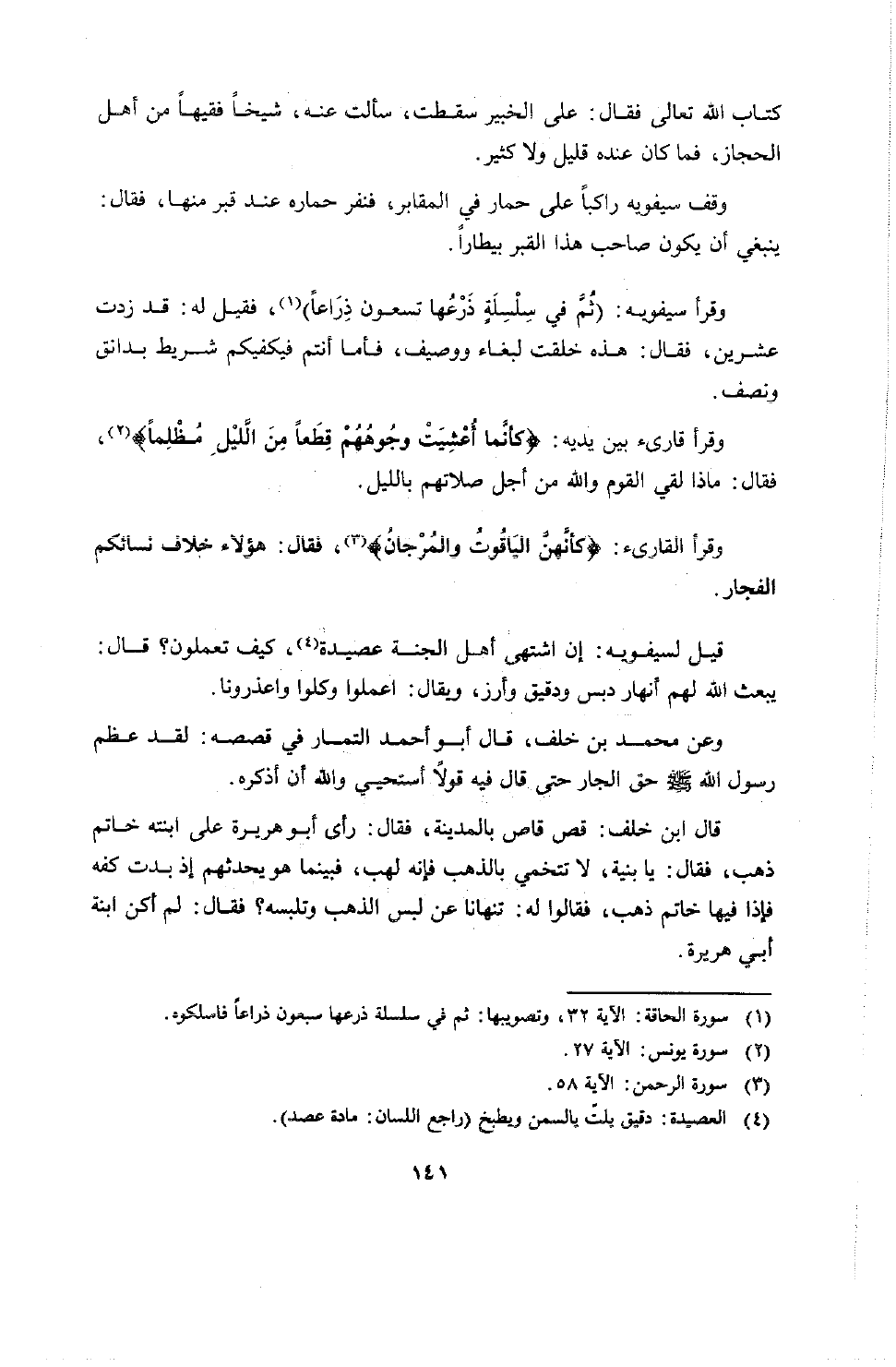 وقرأ سيفويه ثم في سلسلة ذرعها تسعون ذراعاً، فقيل له قد زدت عشرين، فقال: هذه خلقت لبغاء ووصيف، فأما أنتم فيكفيكم شريط بدانق ونصف. وقرأ قارىء بين يديه " كأنما أغشيت وجوههم قطعاً من الليل مظلماً " فقال: ماذا لقي القوم والله من أجل صلاتهم بالليل.