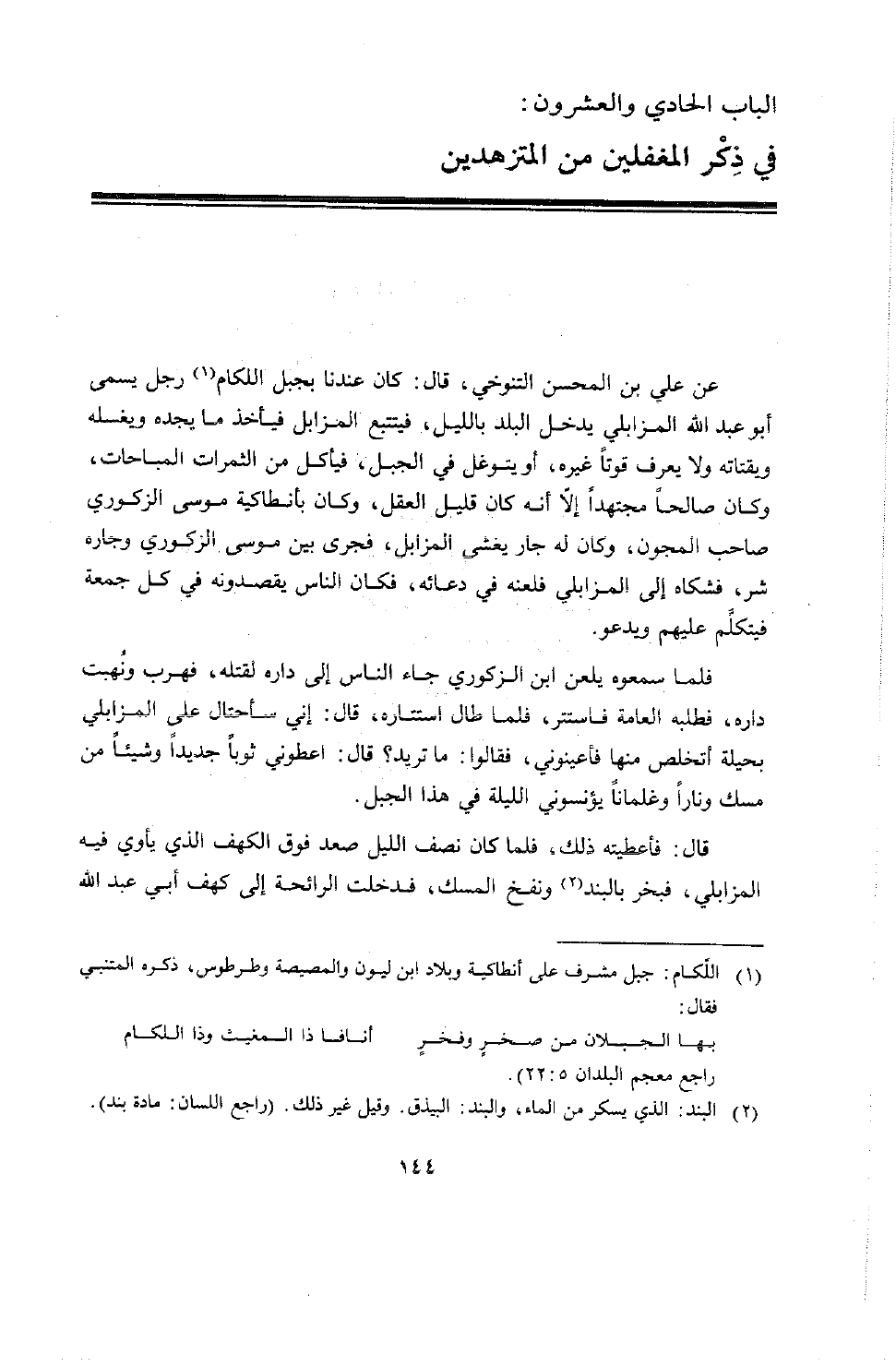عن علي بن المحسن التنوخي قال: كان عندنا بجبل اللكام رجل يسمى أبو عبد الله المزابلي يدخل البلد بالليل فيتتبع المزابل فيأخذ ما يجده ويغسله ويقتاته ولا يعرف قوتاً غيره، أو يتوغل في الجبل فيأكل من الثمرات المباحات، وكان صالحاً مجتهداً إلا أنه كان قليل العقل، وكان بأنطاكية موسى الزكوري صاحب المجون، وكان له جار يغشى المزابل، فجرى بين موسى الزكوري وجاره شر، فشكاه إلى المزابلي فلعنه في دعائه فكان الناس يقصدونه في كل جمعة فيتكلم عليهم ويدعو، فلما سمعوه يلعن ابن الزكوري جاء الناس إلى داره لقتله فهرب ونهبت داره، فطلبه العامة فاستتر فلما طال استتاره قال: إني سأحتال على المزابلي بحيلة أتخلص بها فأعينوني، فقالوا له: ما تريد؟ قال: أعطوني ثوباً جديداً وشيئاً من مسك وناراً وغلماناً يؤنسوني الليلة في هذا الجبل، قال: فأعطيته ذلك، فلما كان نصف الليل صعد فوق الكهف الذي يأوي فيه المزابلي فبخر بالند ونفخ المسك فدخلت الرائحة إلى كهف أبي عبد الله