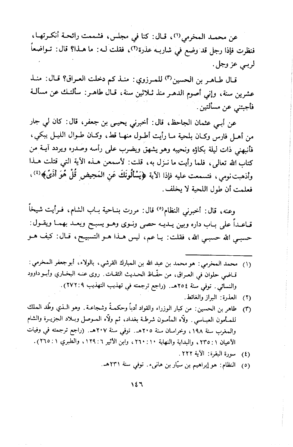 عن أبي عثمان الجاحظ قال: أخبرني يحيى بن جعفر قال: كان لي جار من أهل فارس وكان بلحية ما رأيت أطول منها قط، وكان طول الليل يبكي، فأنبهني ذات ليلة بكاؤه ونحيبه وهو يشهق ويضرب على رأسه وصدره ويردد آية من كتاب الله تعالى، فلما رأيت ما نزل به قلت لأسمعن هذه الآية التي قتلت هذا وأذهب نومي، فتسمعت عليه فإذا الآية " يسألونك عن المحيض قل هو أذى " فعلمت أن طول اللحية لا يخلف.
