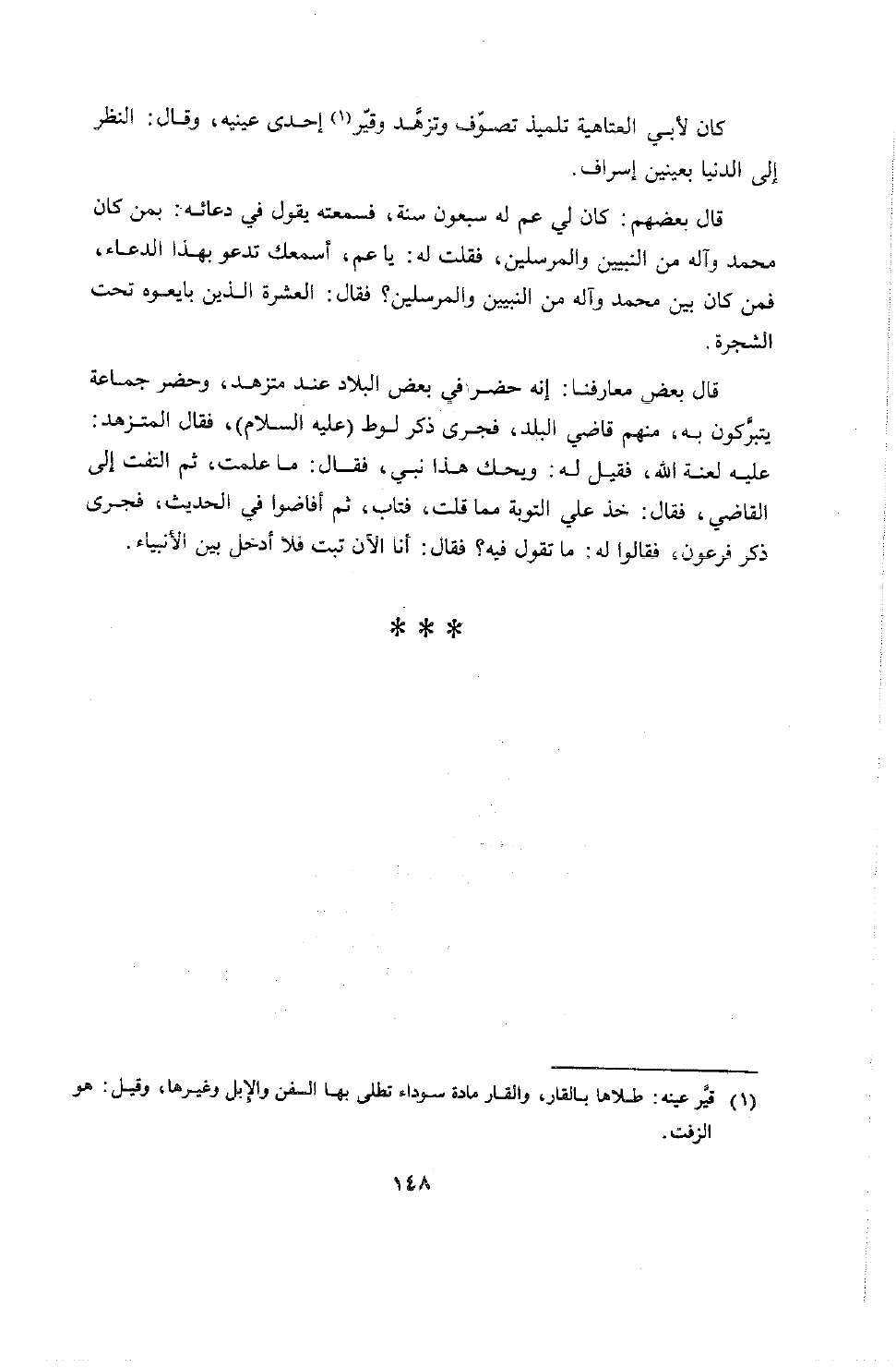 قال بعض معارفنا: إنه حضر في بعض البلاد عند متزهد، وحضر جماعة يتبركون به، منهم قاضي البلاد، فجرى ذكر لوط عليه السلام فقال المتزهد: عليه لعنة الله، فقيل له: ويحك هذا نبي، فقال: ما علمت، ثم التفت إلى القاضي فقال: خذ علي التوبة مما قلت، فتاب، ثم أفاضوا في الحديث فجرى ذكر فرعون فقالوا له: ما تقول فيه؟ فقال: أنا الآن تبت فلا أدخل بين الأنبياء.