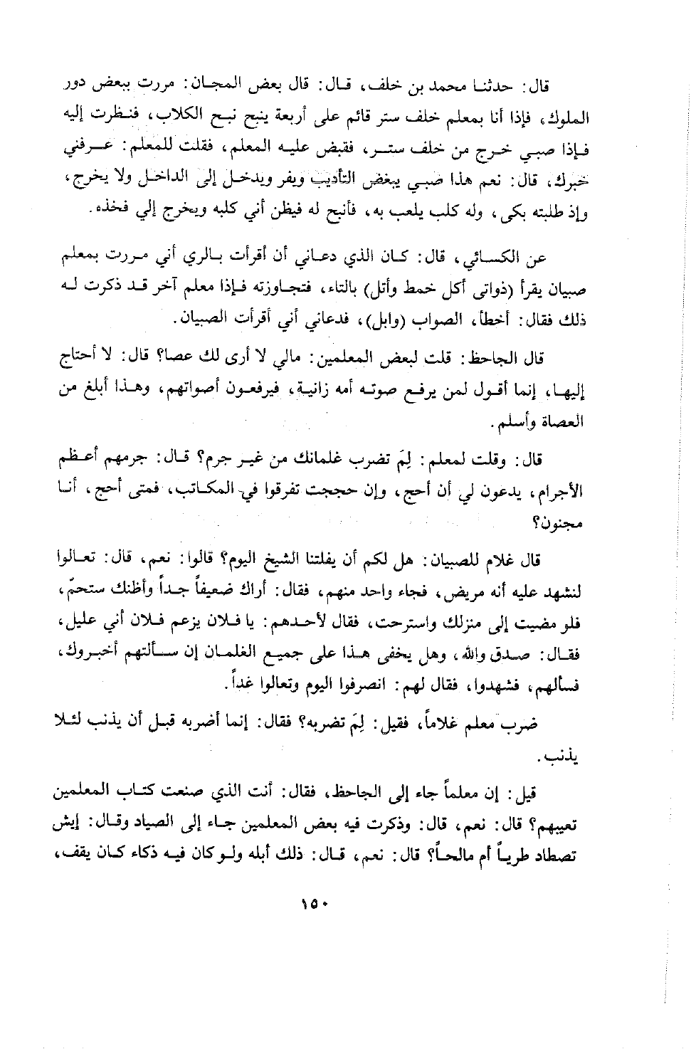 قال: حدثنا محمد بن خلف قال: قال بعض المجان: مررت ببعض دور الملوك، فإذا أنا بمعلم خلف ستر قائم على أربعة ينبح نبح الكلاب، فنظرت إليه فإذا صبي خرج من خلف الستر، فقبض عليه المعلم، فقلت للمعلم: عرفني خبرك، قال: نعم، هذا صبي يبغض التأديب ويفر، ويدخل إلى الداخل ولا يخرج، وإذا طلبته بكى، وله كلب يلعب به فأنبح له فيظن أني كلبه ويخرج إليه فآخذه.