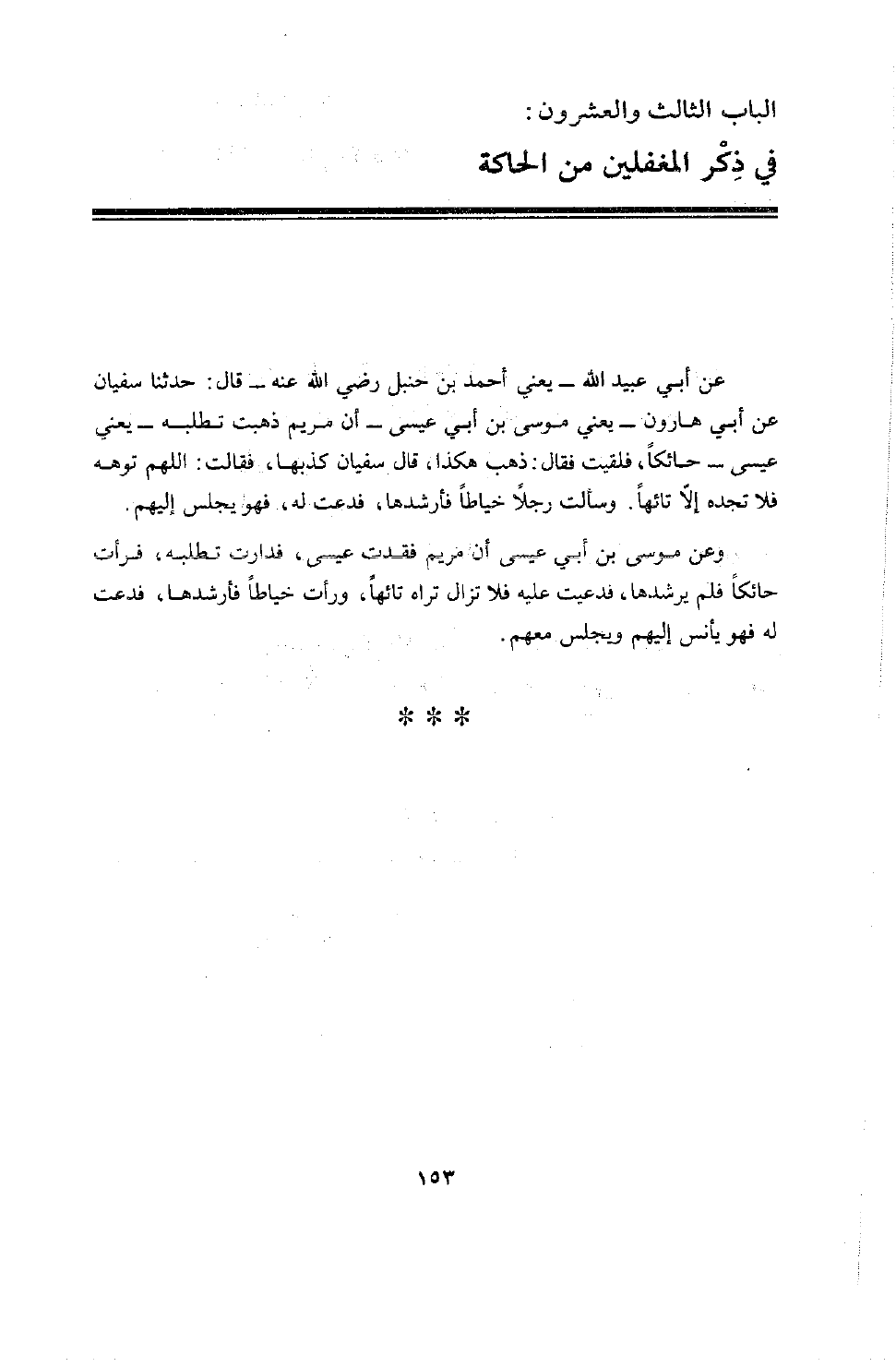 عن أبي عبد الله يعني أحمد بن حنبل رضي الله عنه قال: حدثنا سفيان عن أبي هرون يعني موسى بن أبي عيسى أن مريم ذهبت تطلبه يعني عيى فلقيت حائكاً فقال: ذهب هكذا، قال سفيان: كذبها، فقالت: اللهم توهه. فلا تجده إلا تائهاً. وسألت رجلاً خياطاً فأرشدها فدعت له فهو يجلس إليهم.