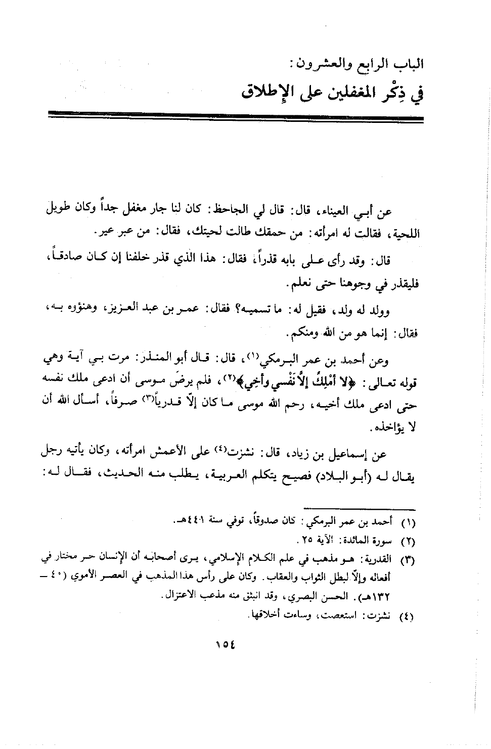 وعن أحمد بن عمر البرمكي قال: قال أبو المنذر: مرت بي آية وهي قوله تعالى: " لا أملك إلا نفسي وأخي "، فلم يرض موسى أن ادعى ملك نفسه حتى ادعى ملك أخيه، رحم الله موسى ما إن كان إلا قدرياً صرفاً، أسأل الله أن لا يؤاخذه.