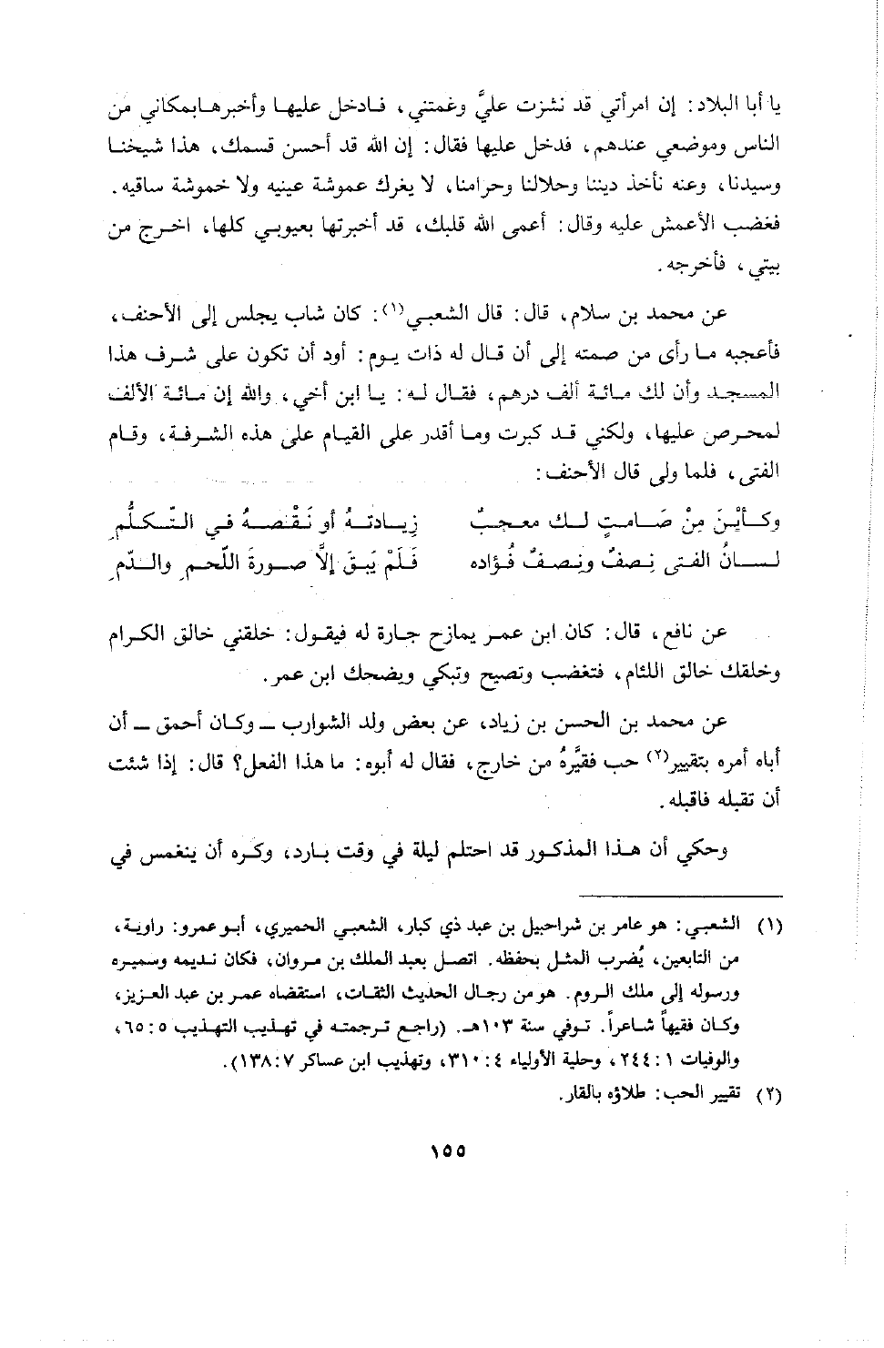 عن محمد بن سلام قال: قال الشعبي: كان شاب يجلس إلى الأحنف، فأعجبه ما رأى من صمته إلى أن قال له ذات يوم: أود أن تكون على شرف هذا المسجد وإن لك مائة ألف درهم، فقال له: يا ابن أخي، والله إن مائة الألف لمحروص عليها، ولكني قد كبرت وما أقدر على القيام على هذه الشرفة، وقام الفتى، فلما ولى قال الأحنف: الطويل: