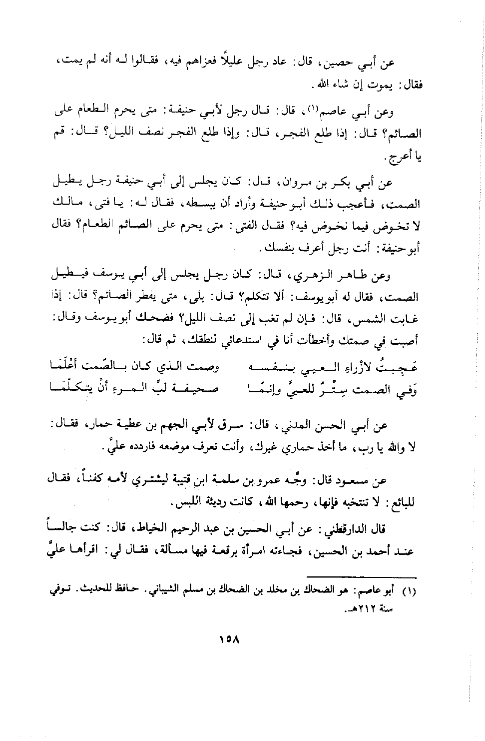 وعن أبي عاصم قال: قال رجل لأبي حنيفة: متى يحرم الطعام على الصائم؟ قال: إذا طلع الفجر، قال: وإذا طلع الفجر نصف الليل؟ قال: قم يا أعرج.