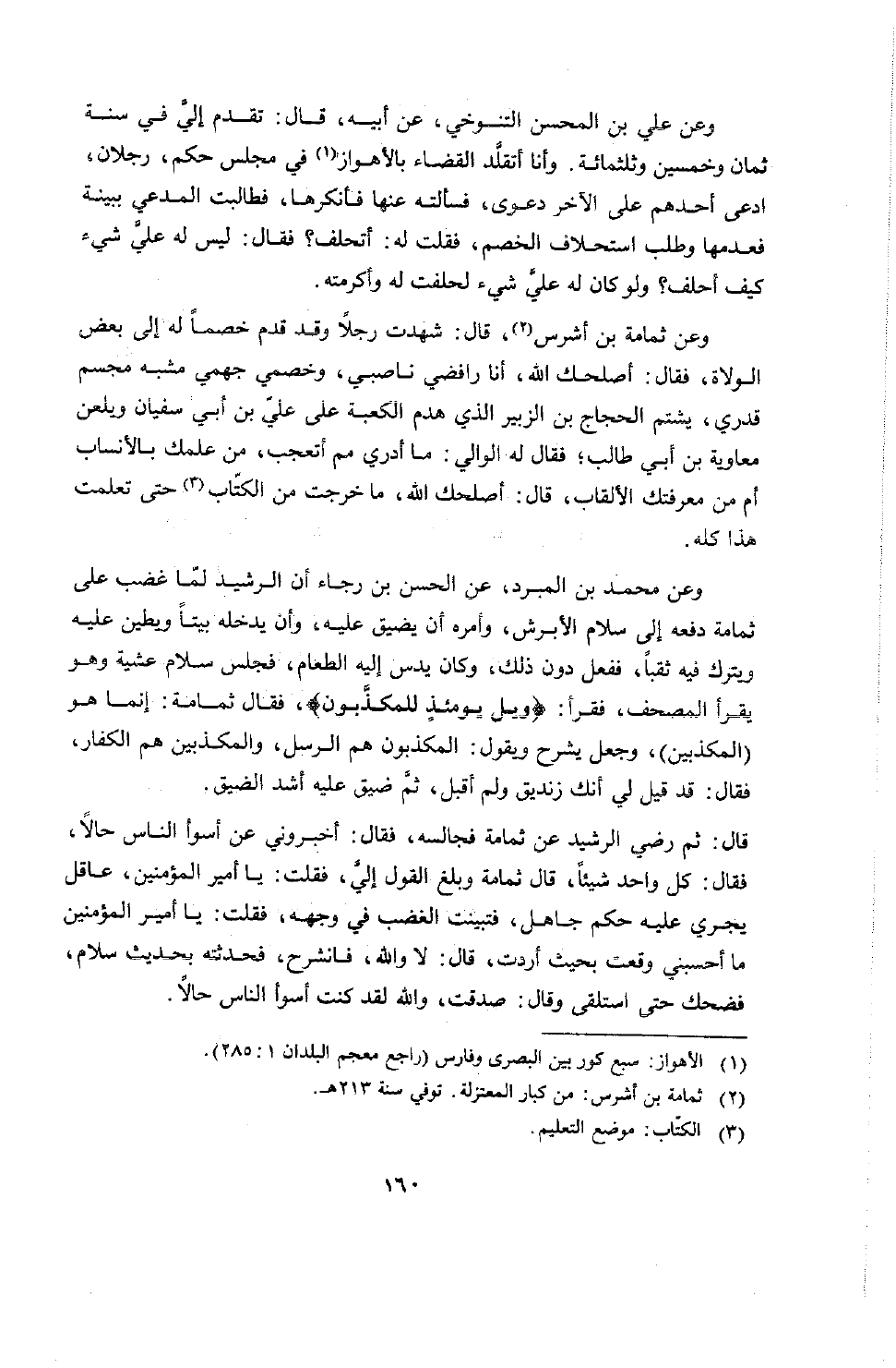 وعن ثمامة بن أشرس قال: شهدت رجلاً وقد قدم خصماً له إلى بعض الولاة فقال: أصلحك الله، أنا رافضي ناصبي، وخصمي جهمي مشبه مجسم قدري، يشتم الحجاج بن الزبير الذي هدم الكعبة على علي بن أبي سفيان ويلعن معاوية بن أبي طالب؛ فقال له الوالي: ما أدري مم أتعجب، من علمك بالأنساب أم من معرفتك الألقاب، قال: أصلحك الله، ما خرجت من الكتاب حتى تعلمت هذا كله.