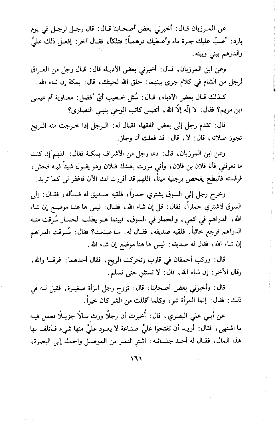 عن المرزبان قال: أخبرني بعض أصحابنا قال: قال رجل لرجل في يوم بارد: أصبت عليك جرة ماء وأعطيك درهماً! فتلكأ، فقال آخر: إفعل ذلك علي والدرهم بيني وبينه.