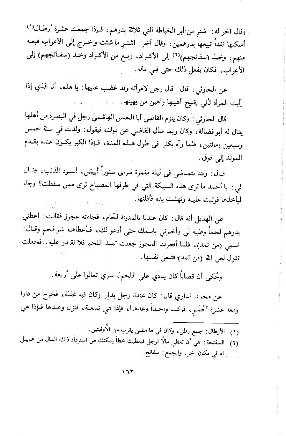 وقال آخر له: اشتر من ابر الخياطة التي ثلاثة بدرهم فإذا جمعت عشرة أرطال أسبكها نقداً تبيعها بدرهمين، وقال آخر: اشتر ما شئت واخرج إلى الأعراب فبعه منهم، وخذ سفاتجهم إلى الأكراد، وبع من الأكراد وخذ سفاتجهم إلى الأعراب، فكان يفعل ذلك حتى فني ماله.